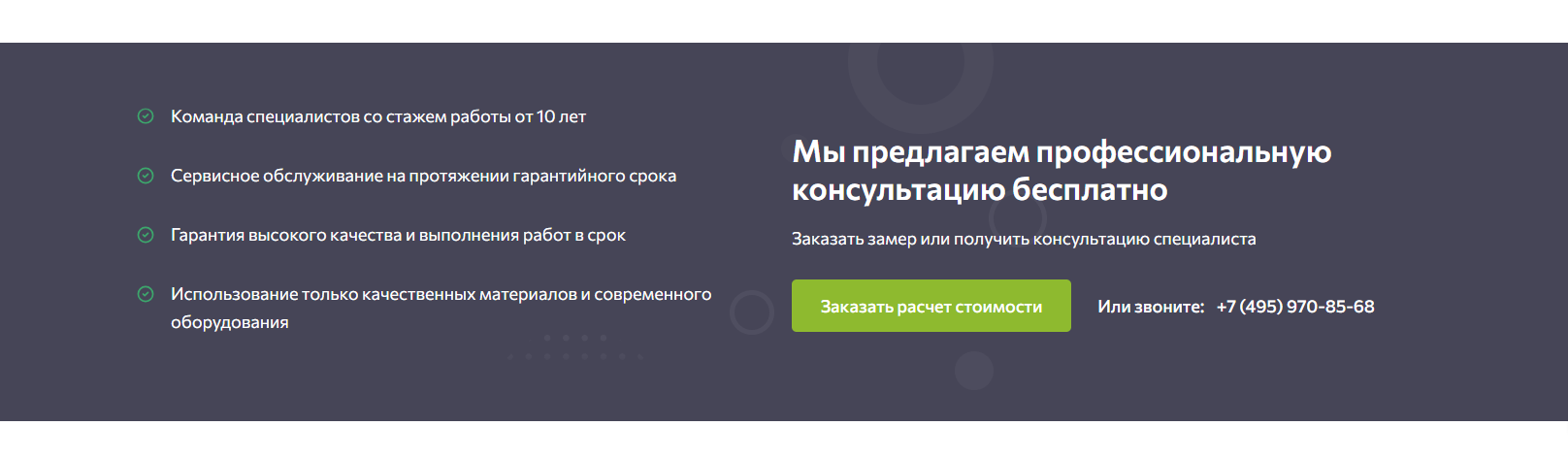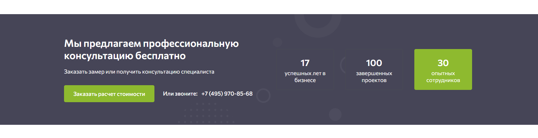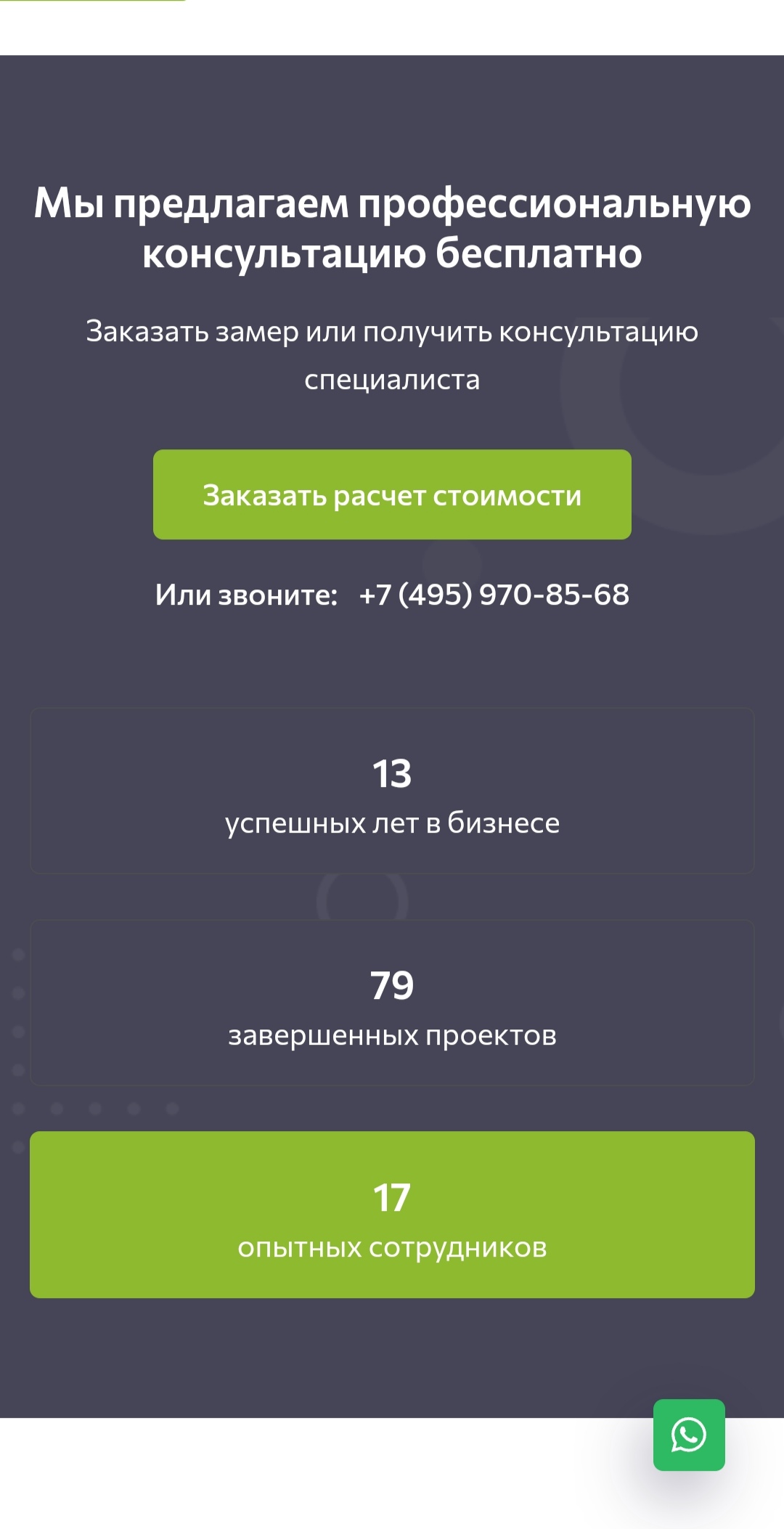 Ниже мы представили раздел «Портфолио» с работами компании. Такое решение позволяет пользователю ознакомится с примерами выполненных работ и усилить лояльность к ней.