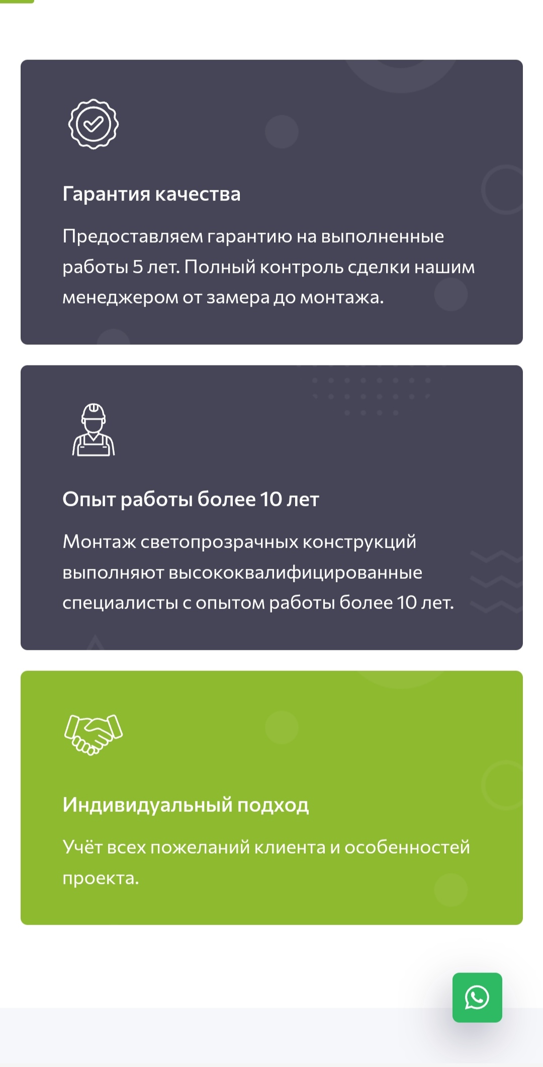 На главной странице сайта информационные блоки чередуются с блоками призыва к действию. Это обеспечивает легкий доступ к контактной информации и делает обратную связь удобнее, всегда оставаясь на виду.