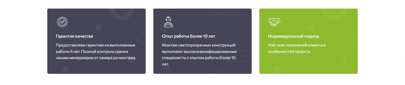 Ниже мы представили раздел «Портфолио» с работами компании. Такое решение позволяет пользователю ознакомится с примерами выполненных работ и усилить лояльность к ней.