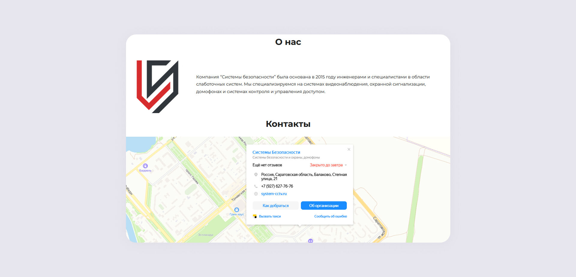 Остается показать информацию о нас, и блок с картой, для удобной навигации, на случай, если хочешь воспользоваться Яндекс.Картам или Навигатором