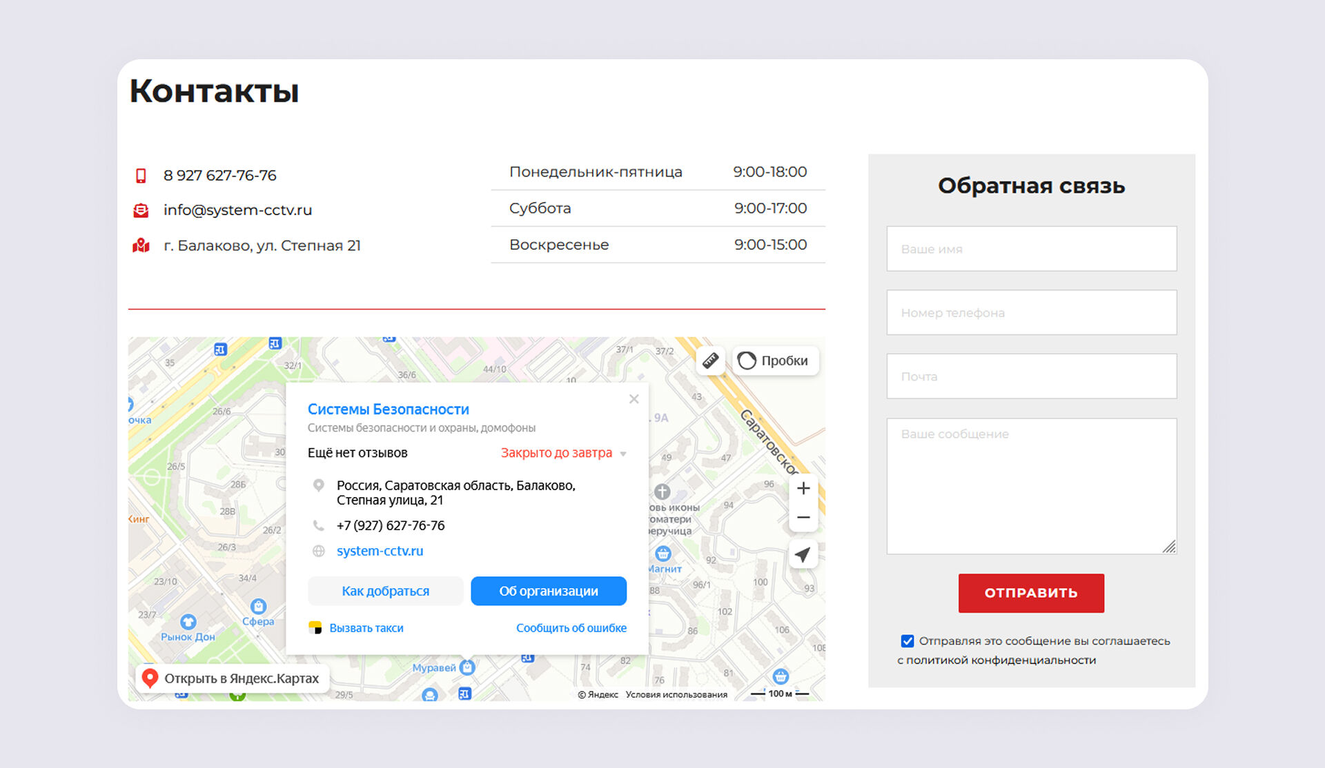 Ни один сайт не обходится без страницы «Контакты», на которой размещаются все контактные данные, карта и форма обратной связи.