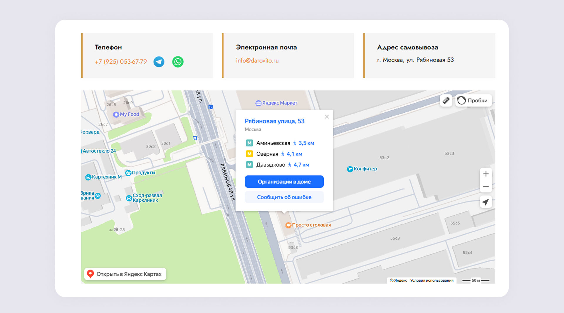 Телефон со ссылками на мессенджеры, e-mail и адрес самовывоза с картой: