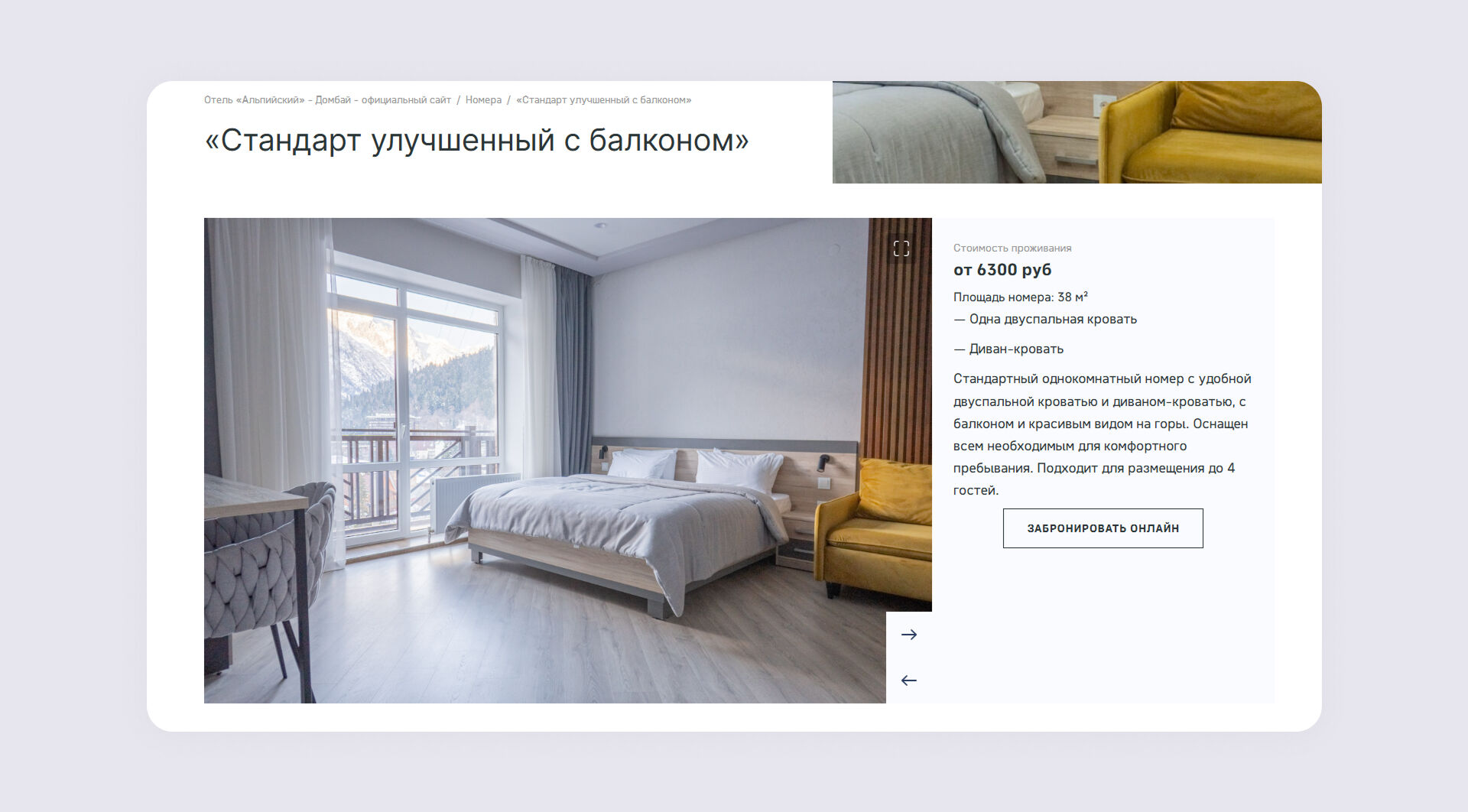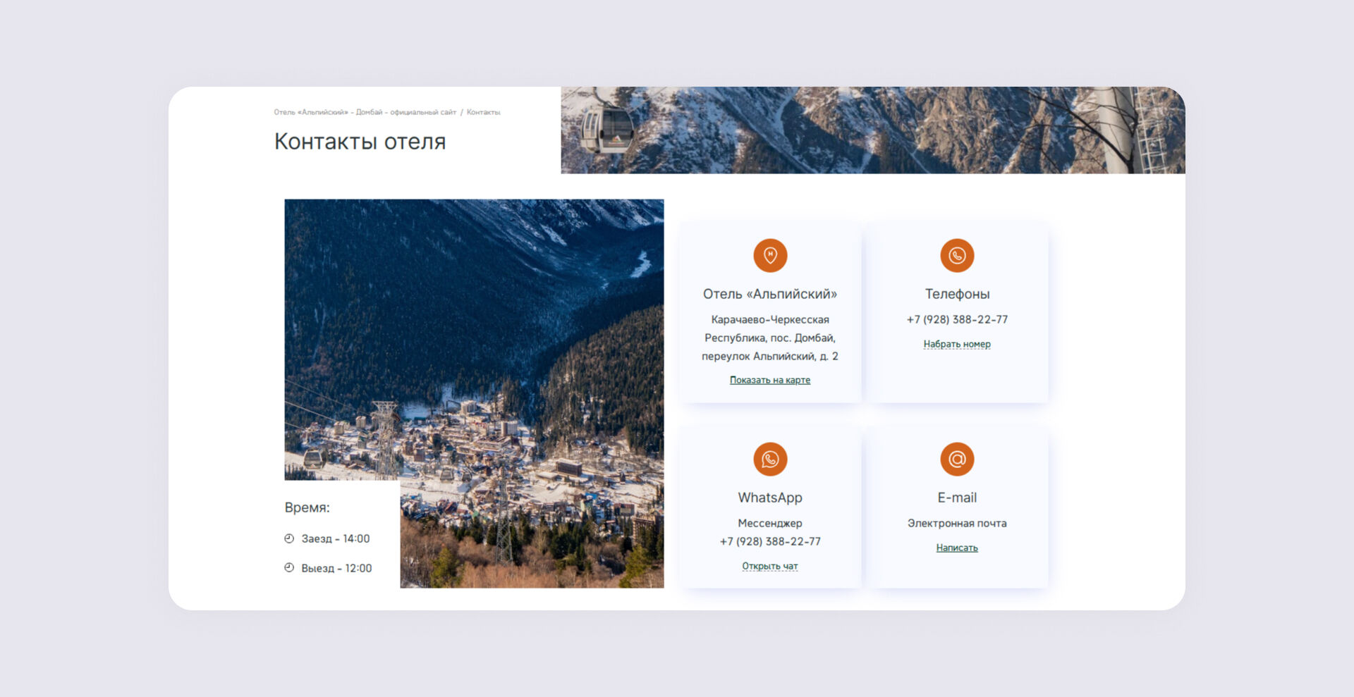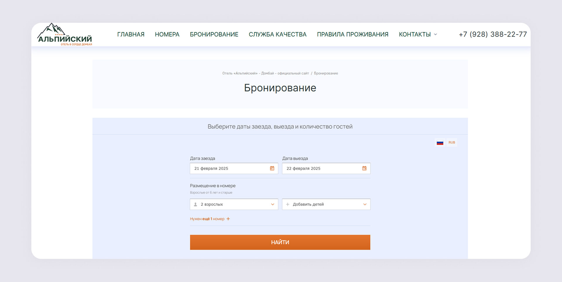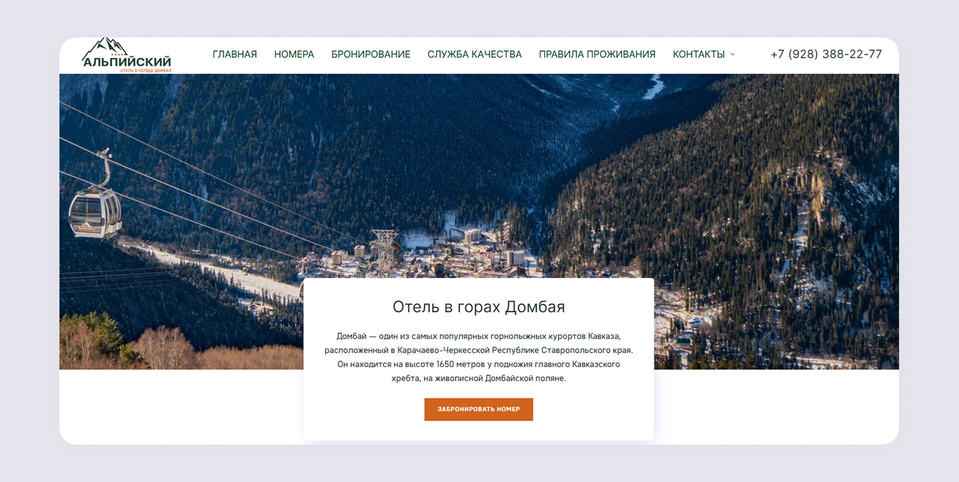 На Главной странице пользователя встречает передающее атмосферу изображение Домбая и номер телефона для прямой связи с отелем. Также на постере имеется кнопка перехода к бронированию, ведущая на страницу с удобным модулем бронирования.