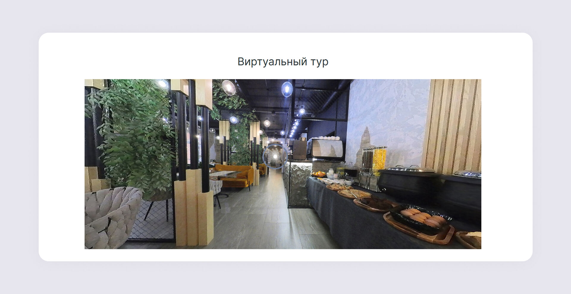 Одним из интересных решений стало размещение блока «Виртуальный тур», позволяющего пользователю буквально пройтись по отелю и почувствовать его атмосферу. Размещение виртуального тура на сайте увеличивает вовлеченность, улучшает пользовательский опыт, тур доступен 24/7, является конкурентным преимуществом, повышает конверсию и упрощает маркетинг.