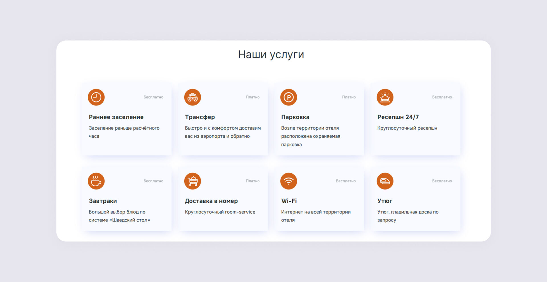 Ниже мы добавили блок «Наши услуги», в котором представлена информация о платных и бесплатных услугах, доступных в отеле «Альпийский». Наши дизайнеры создали иконки для каждой услуги.