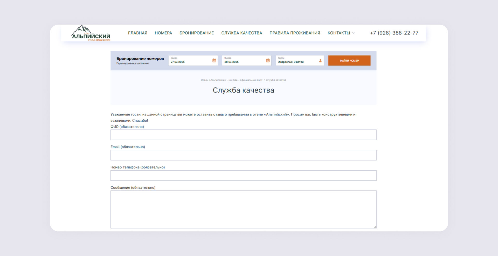 Для удобства гостей была создана страница «Служба качества», чтобы они могли легко оставлять свои отзывы. Форма обратной связи включает несколько полей для ввода информации и позволяет делиться как впечатлениями, так и предложениями. Также в форме есть возможность прикреплять изображения.