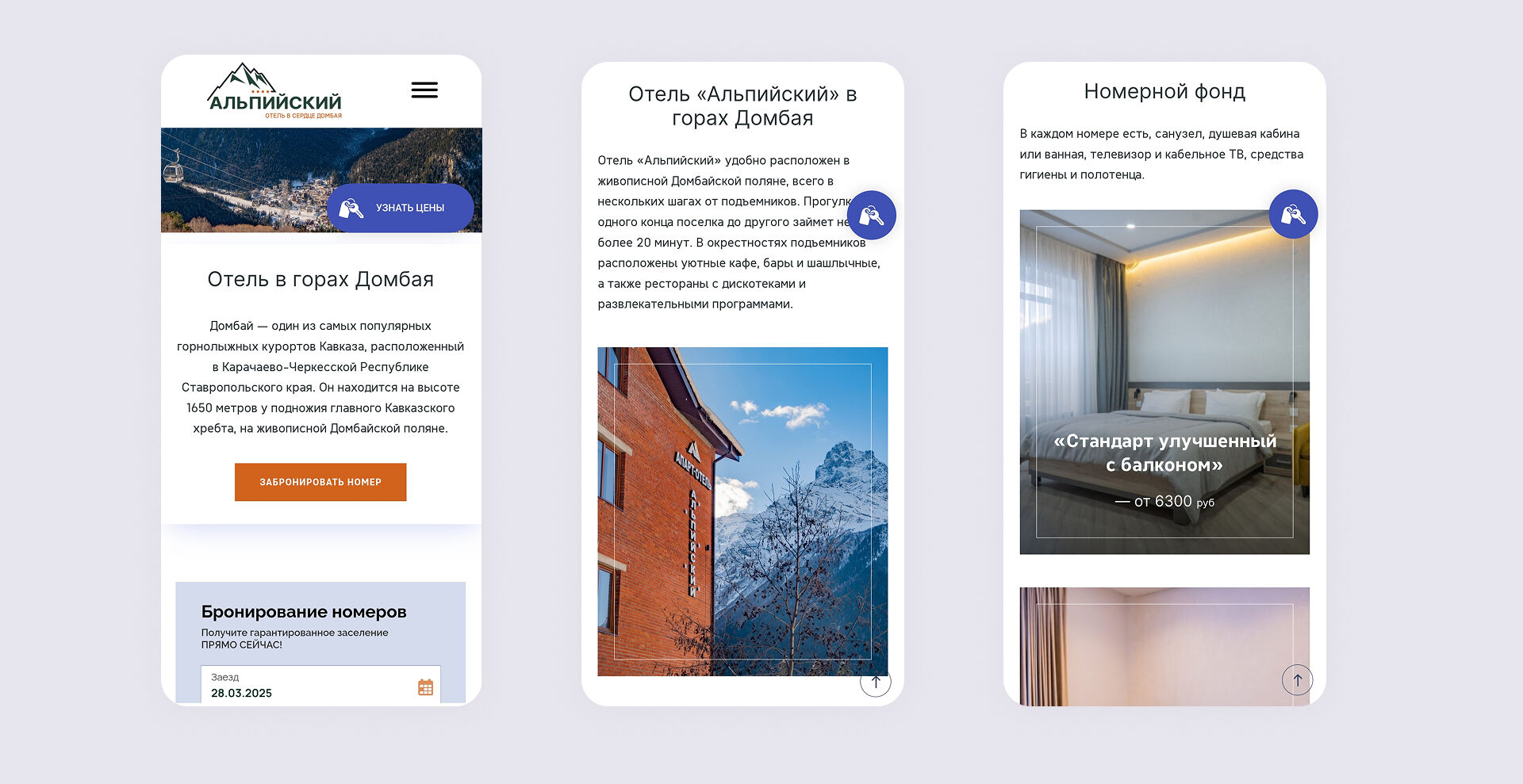 Мобильная версия сайта отеля «Альпиский» имеет удобный интерфейс и адаптивный дизайн, что позволяет пользователям легко находить нужную информацию и взаимодействовать с контентом.