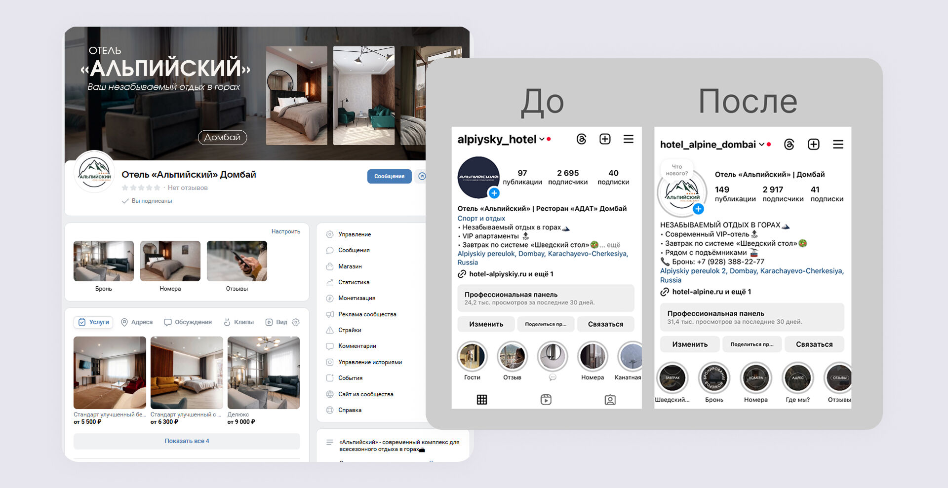 Параллельно с разработкой сайта стартовала работа над социальными сетями. Мы провели анализ конкурентов и определили моменты, которые могут заинтересовать потенциальных гостей отеля. А именно: удобное расположение, комфортные условия для отдыха, красивый вид из окна и близость к подъемникам канатной дороги.