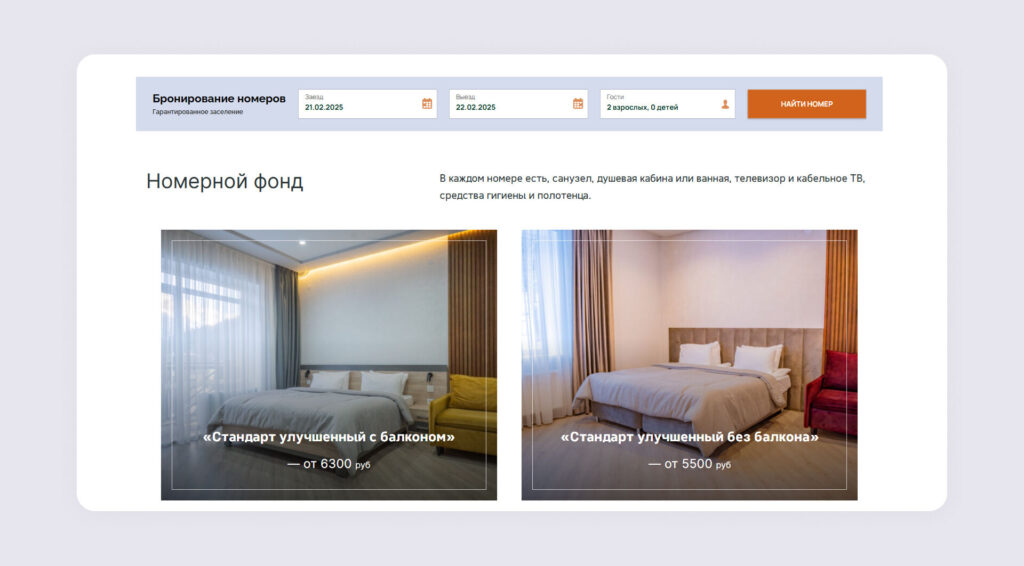 Следующий ниже блок «Номерной фонд» содержит все имеющиеся в отеле категории номеров и информацию о них: название, изображение и стоимость, а при наведении курсора на фото также отображается описание, площадь и ёмкость номера. Наглядная подача исчерпывающей информации облегчает выбор и способствует брони.