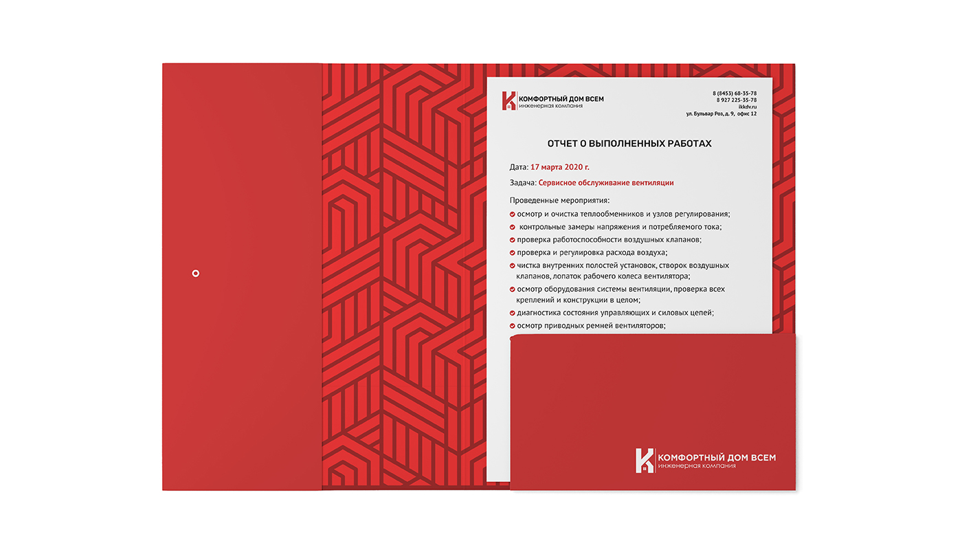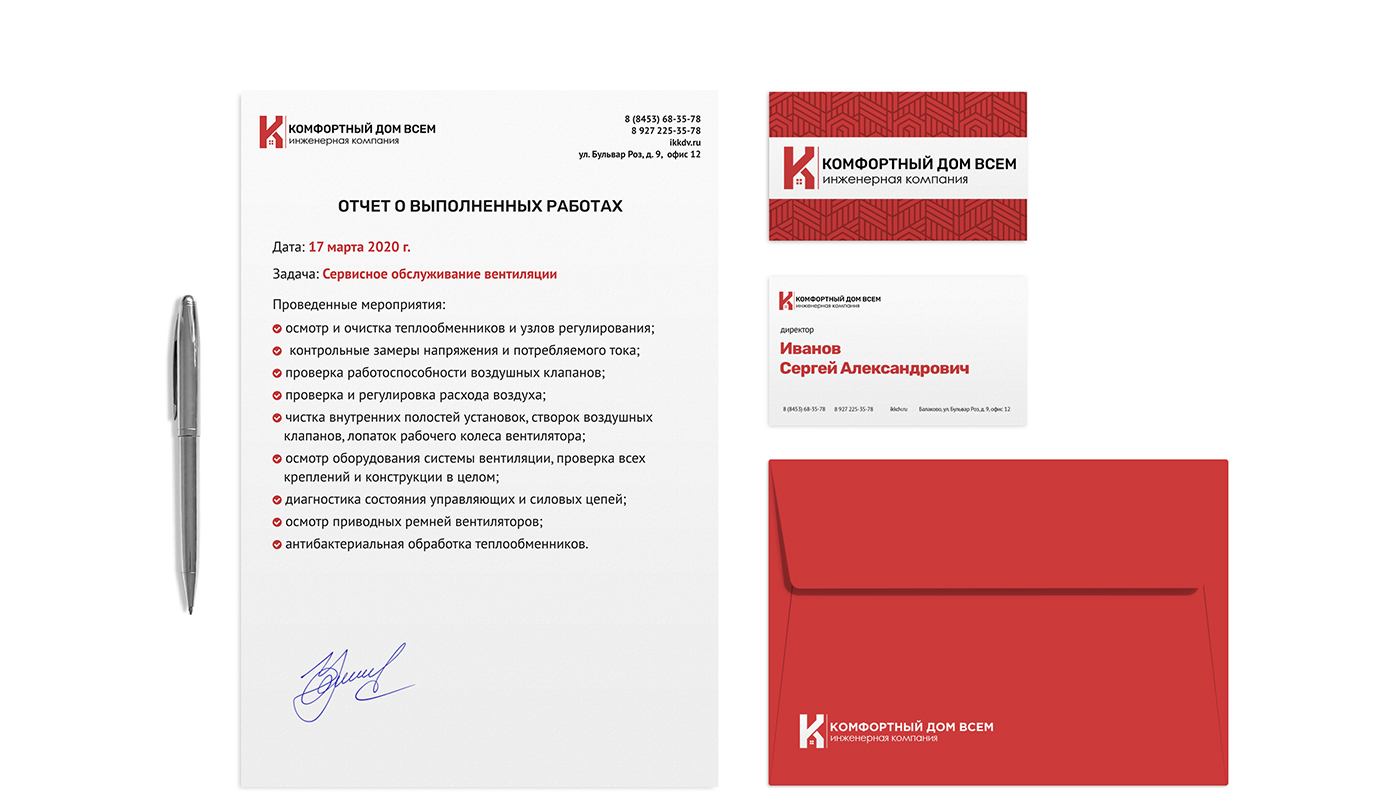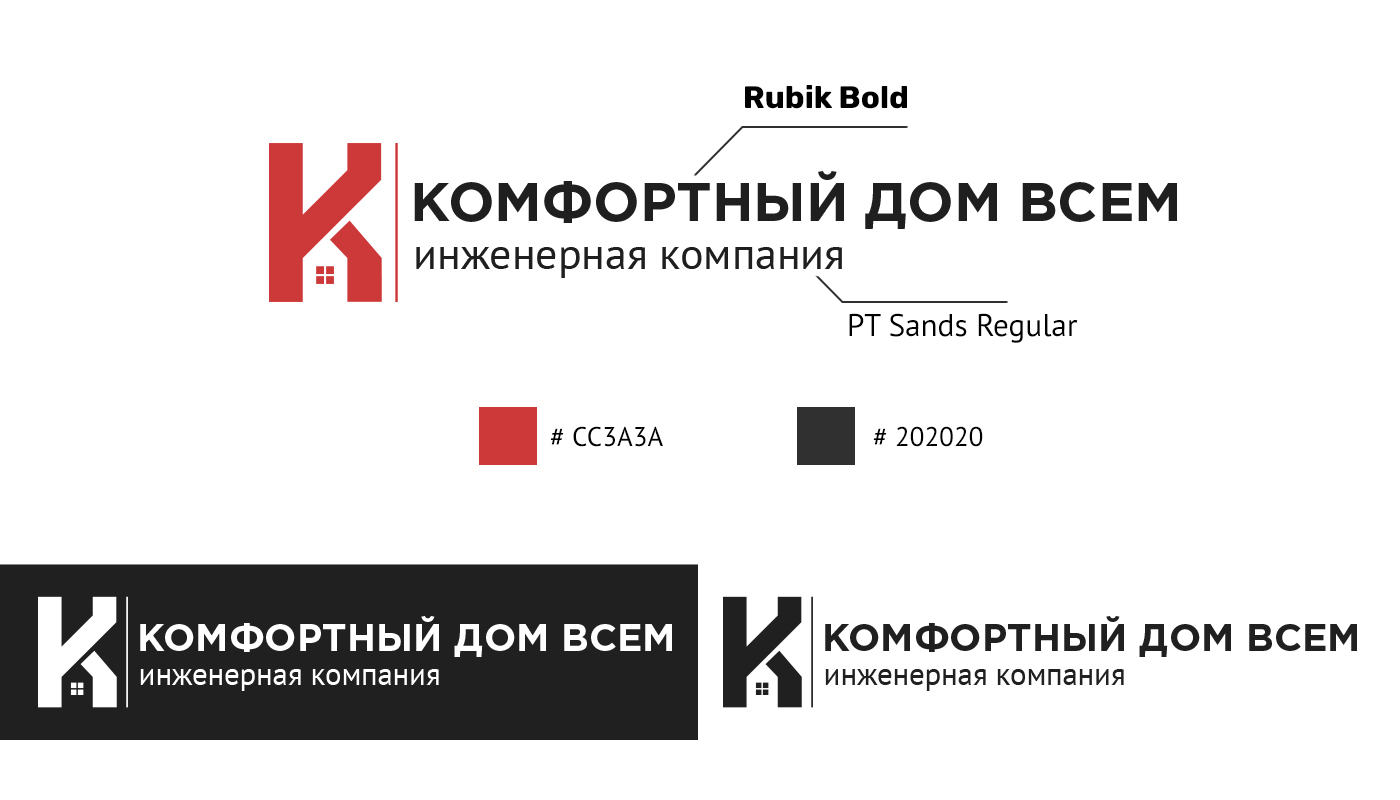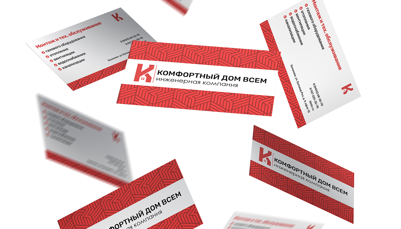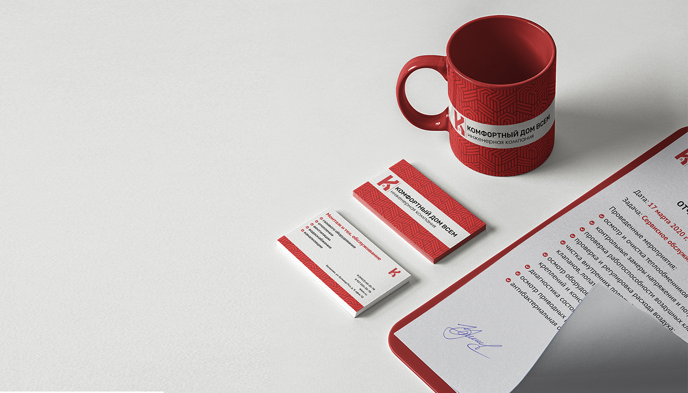 Для инженерной компании создан узнаваемый логотип и адаптивный фирменный стиль. Графический знак представляет букву «К» с вписанным в неё изображением дома. Благодаря такой реализации логотип остается понятным при своей уникальности.