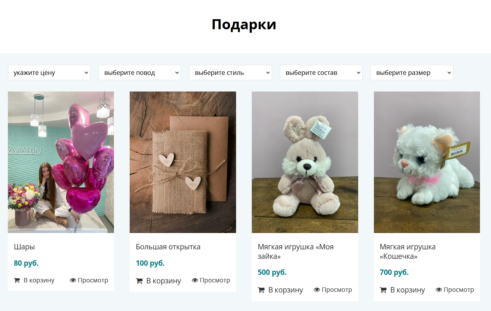 Под кнопкой «В корзину», выводится два рандомных подарка, из категории товаров «Подарки». Клиенты компании ROZMARIN, радуют своих вторых половинок, не только цветами, но и вкусными и красивыми подарками — мишками и шарами.