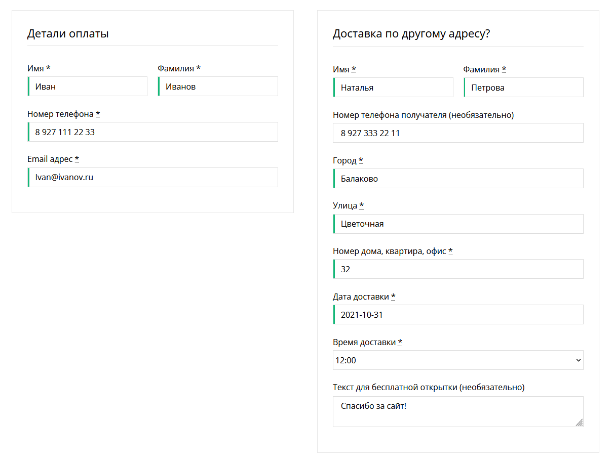 Очень важно собрать с клиента все данные о его заказе/доставке. Это экономит время менеджера, определяет клиента на этапе заполнения данных и уменьшает шанс «пустых» заказов.