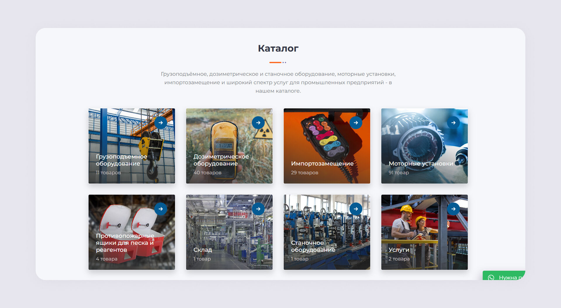 Далее разместили блок каталога, который позволяет быстро ориентироваться и легко находить необходимые категории товаров и услуг. Все категории имеют понятные названия и проиллюстрированы.