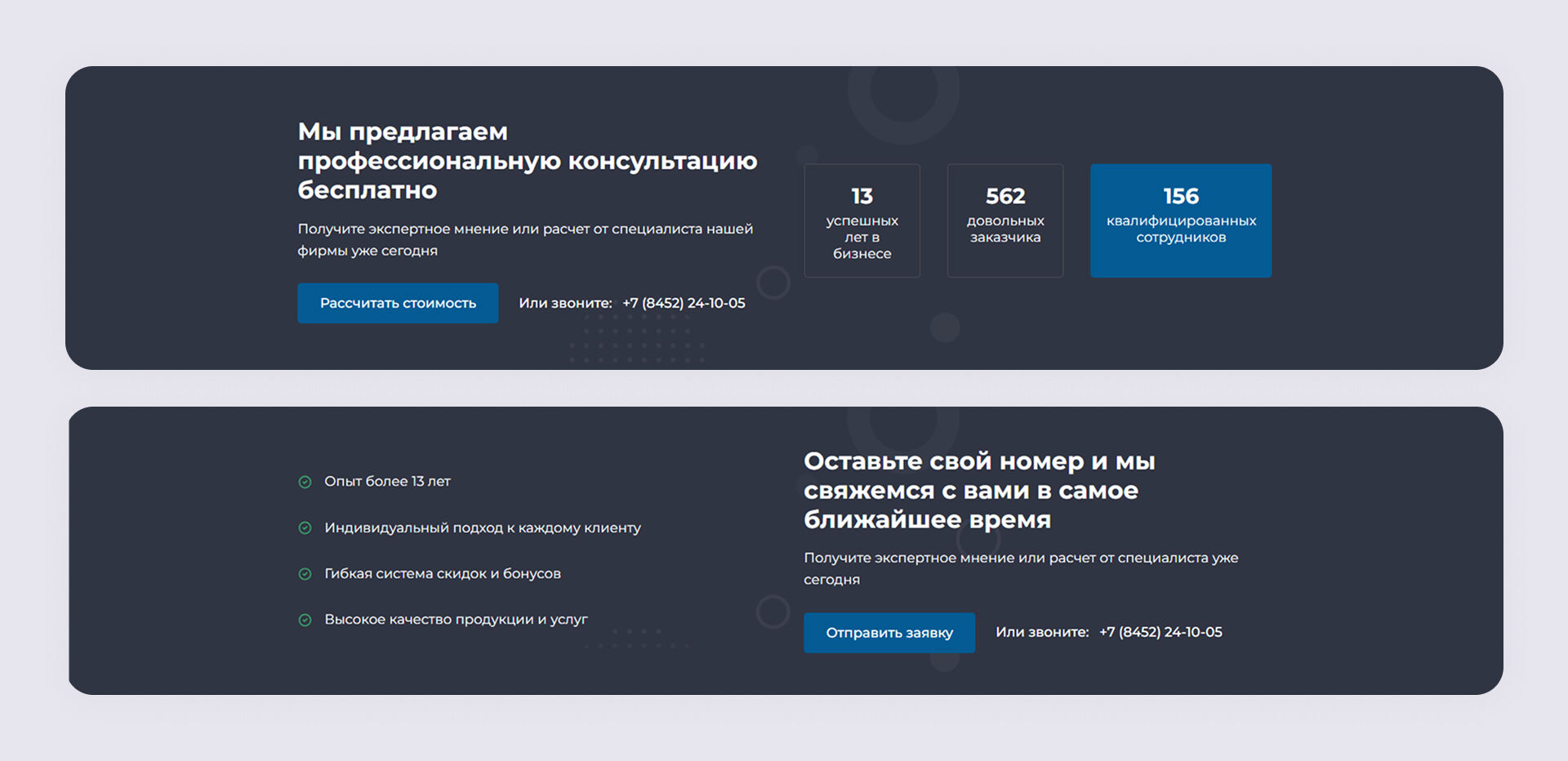 На главной странице сайта информационные разделы органично чередуются с призывами к действию, что обеспечивает легкий доступ к контактной информации и упрощает процесс связи, оставаясь при этом всегда на виду.