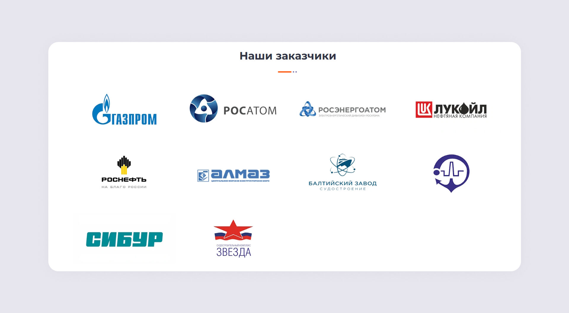 Также разместили блок с логотипами компаний-заказчиков, выбравших «Промтехоснащение» в качестве надежного подрядчика. Размещение логотипов и названий известных компаний выполняет несколько важных задач: демонстрирует доверие, укрепляет репутацию, увеличивает конверсию и вызывает интерес.