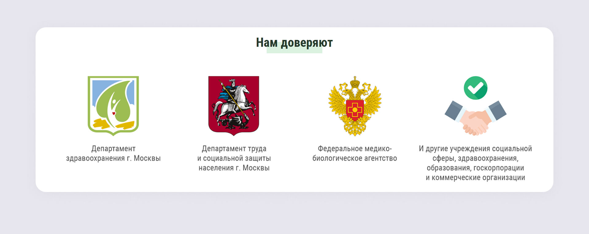 Далее разместили блок «Нам доверяют», в котором показали значимых и многим известных заказчиков, с которыми выстроены долгосрочные партнёрские отношения. Этот раздел демонстрирует высокий уровень доверия и хорошую репутацию компании, а также разнообразие отраслей, с которыми может работать «КАЛИНА ГРУПП».