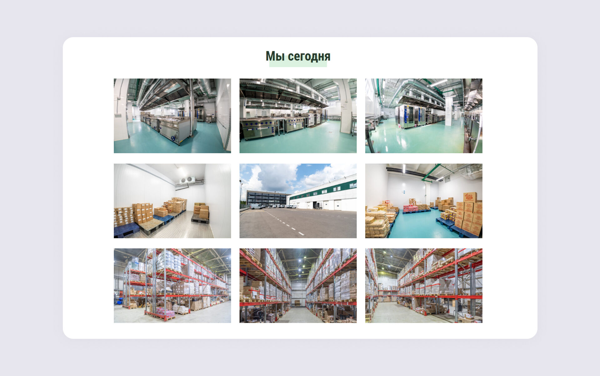 В дополнение к этому наши специалисты-фотографы посетили производство и провели фотосъемку. Наиболее подходящие фотографии поместили в галерею «Мы сегодня» на Главной странице. Это решение улучшает визуальную составляющую сайта и демонстрирует масштаб производства.
