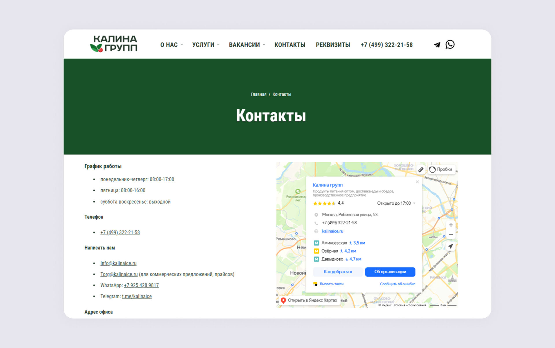 Дополнительно добавили вкладку «Вакансии». Благодаря данному разделу потенциальным соискателям доступна полная информация о возможности трудоустройства в ООО «КАЛИНА ГРУПП».