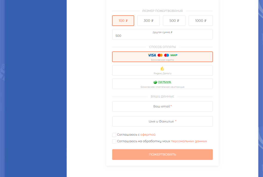 Задача: разработать сайт благотворительного фонда, с возможностью приема пожертвований.