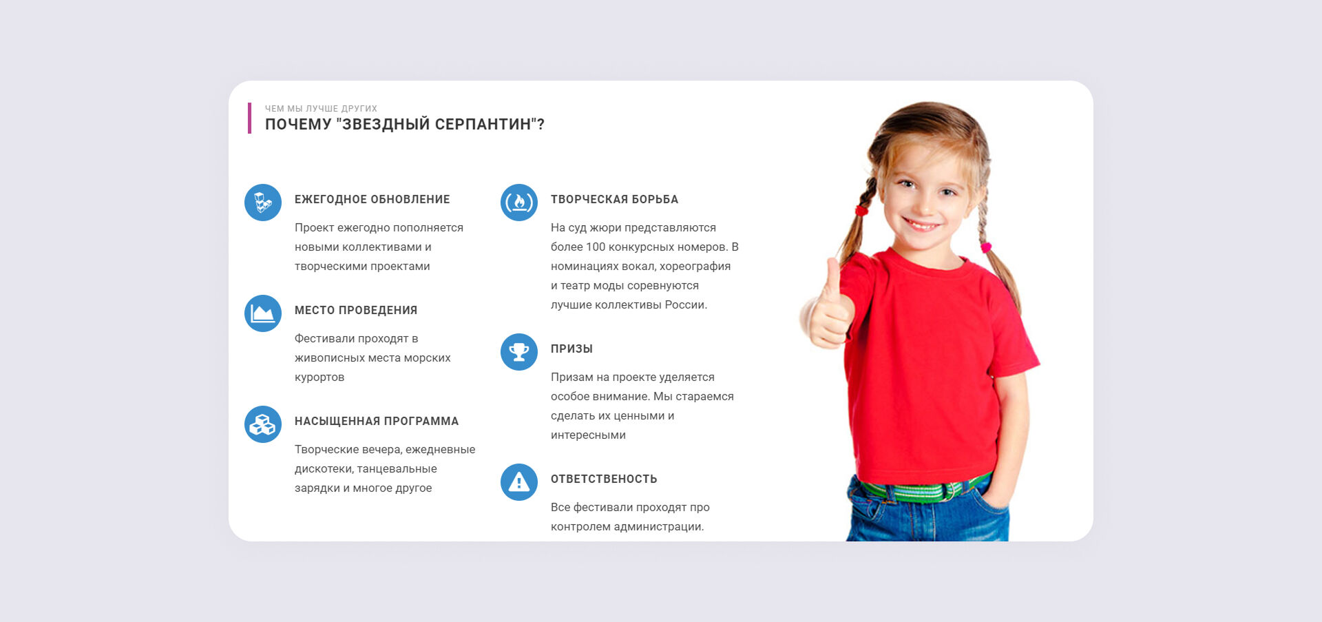 Краткий рассказ о фестивале в виде блоков преимуществ.