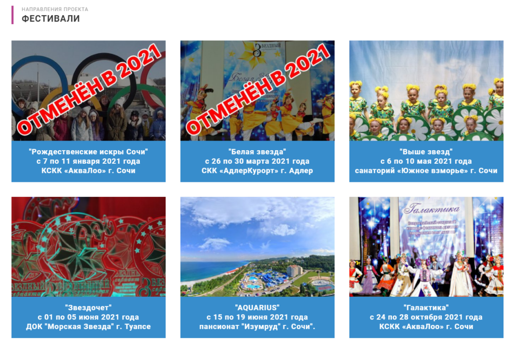 Отдельно есть страницы по каждому фестивалю, но там текст в основном, если хотите — посмотрите сами.