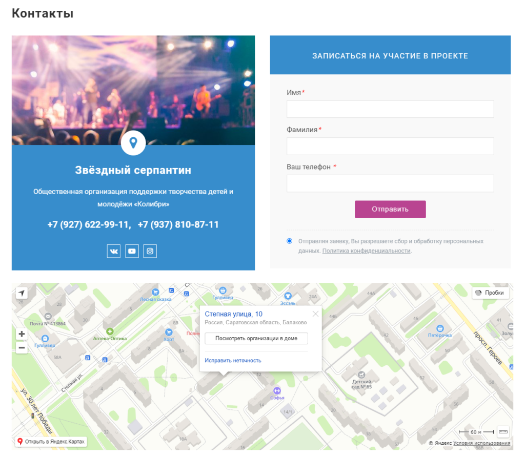 И сама страница с контактами