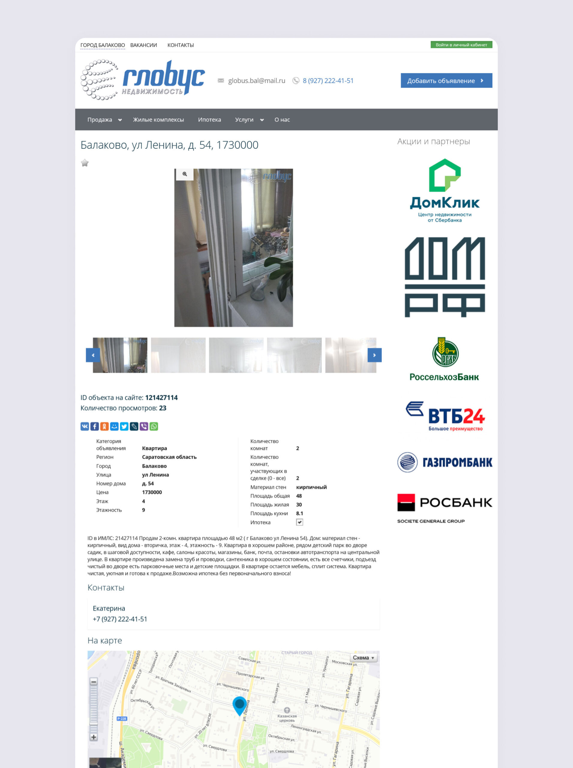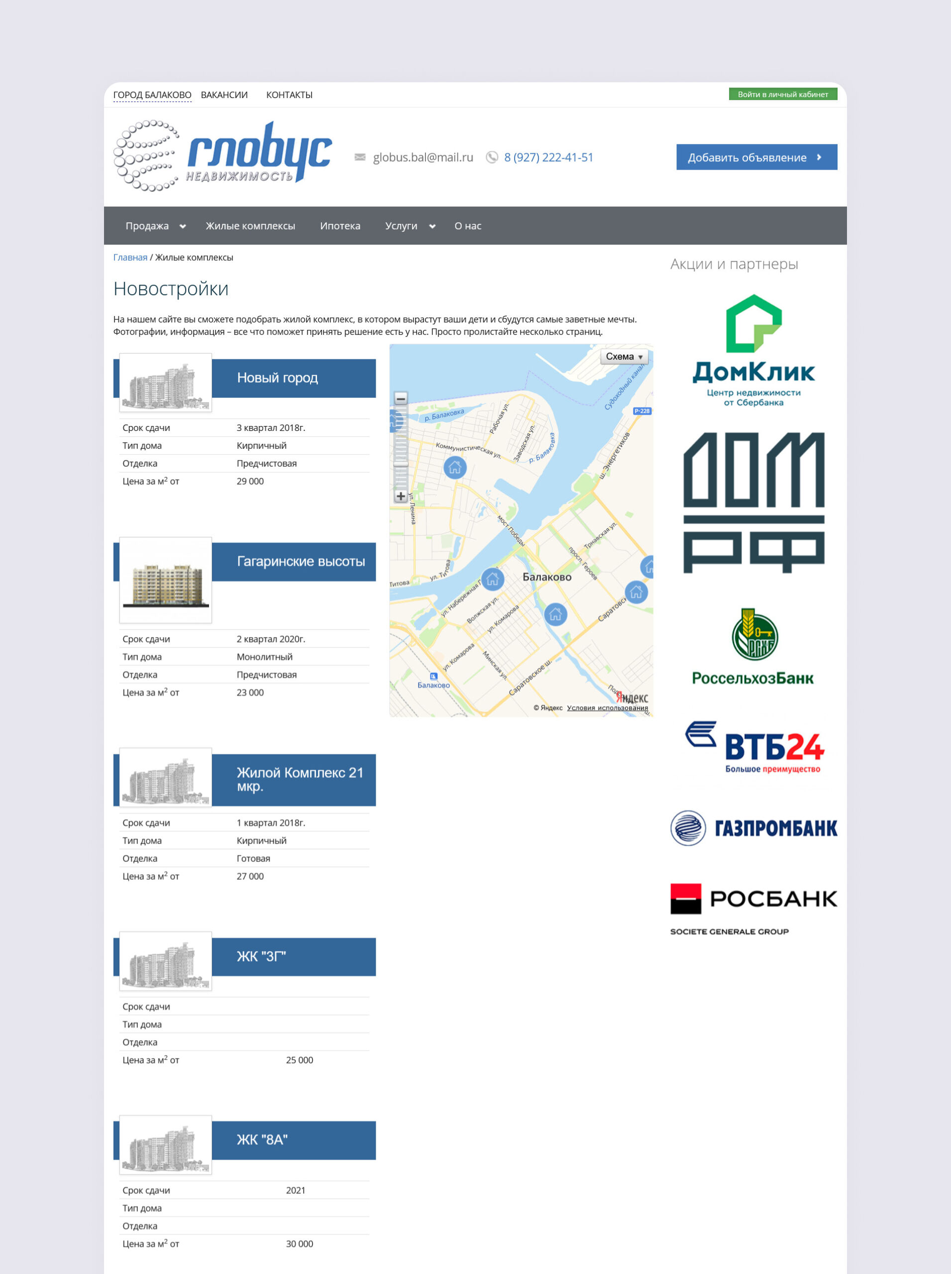 - Разработан сайт для агентства недвижимости с каталогом объектов и интеграцией с CRM системой агентства — globus-balakovo.ru