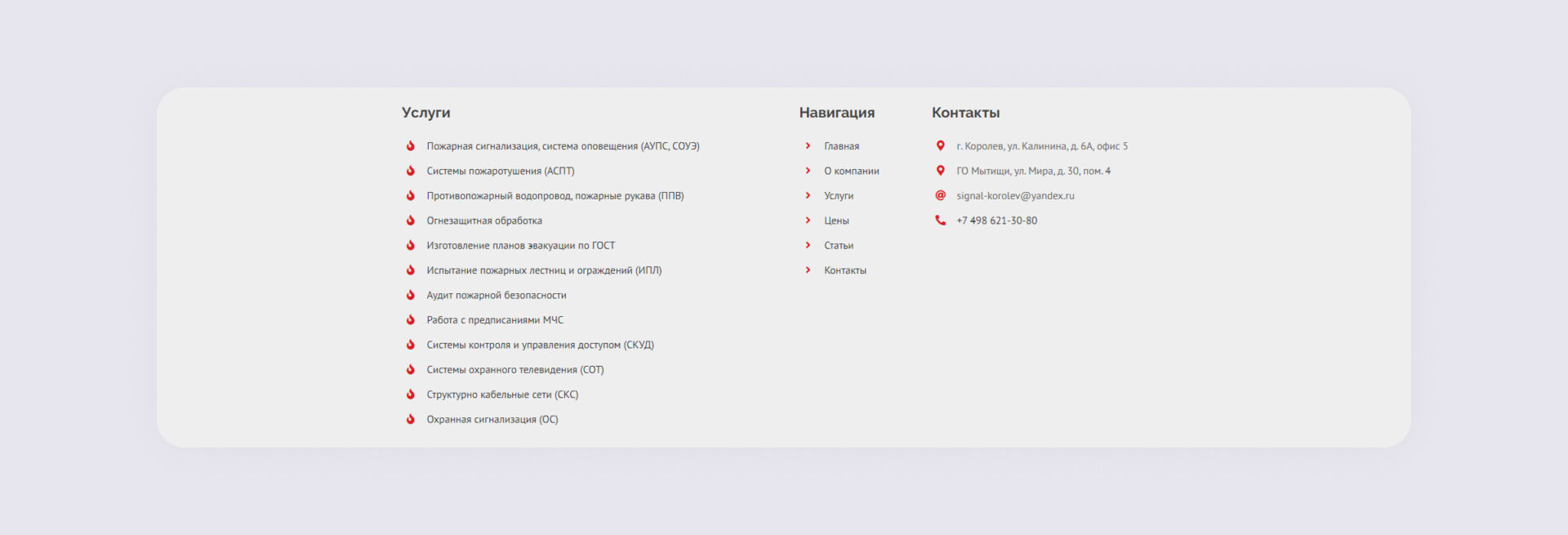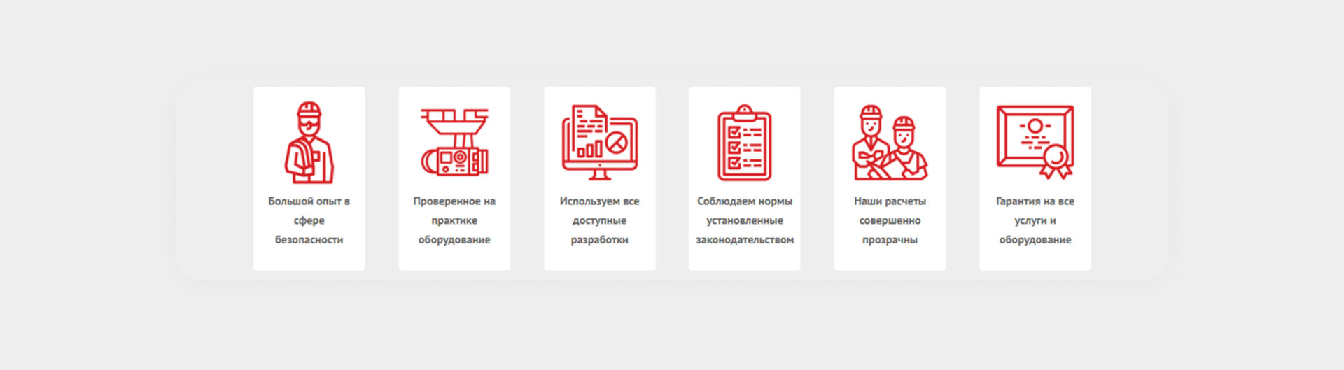 Лаконичные иконки, и классическое дублирование информации представленных на других страницах сайта.
