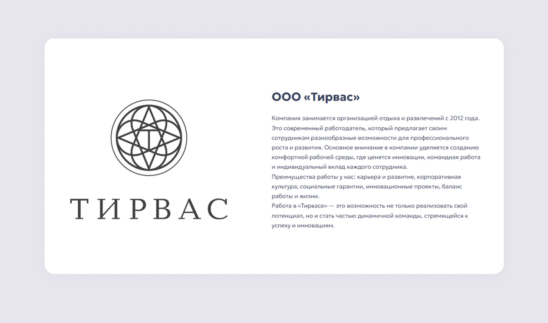 В завершении главной страницы разместили информацию о компании «Тирвас». Блок знакомит пользователя с историей, миссией и ценностями компании. Данная информация формирует и дополняет представление о ней.