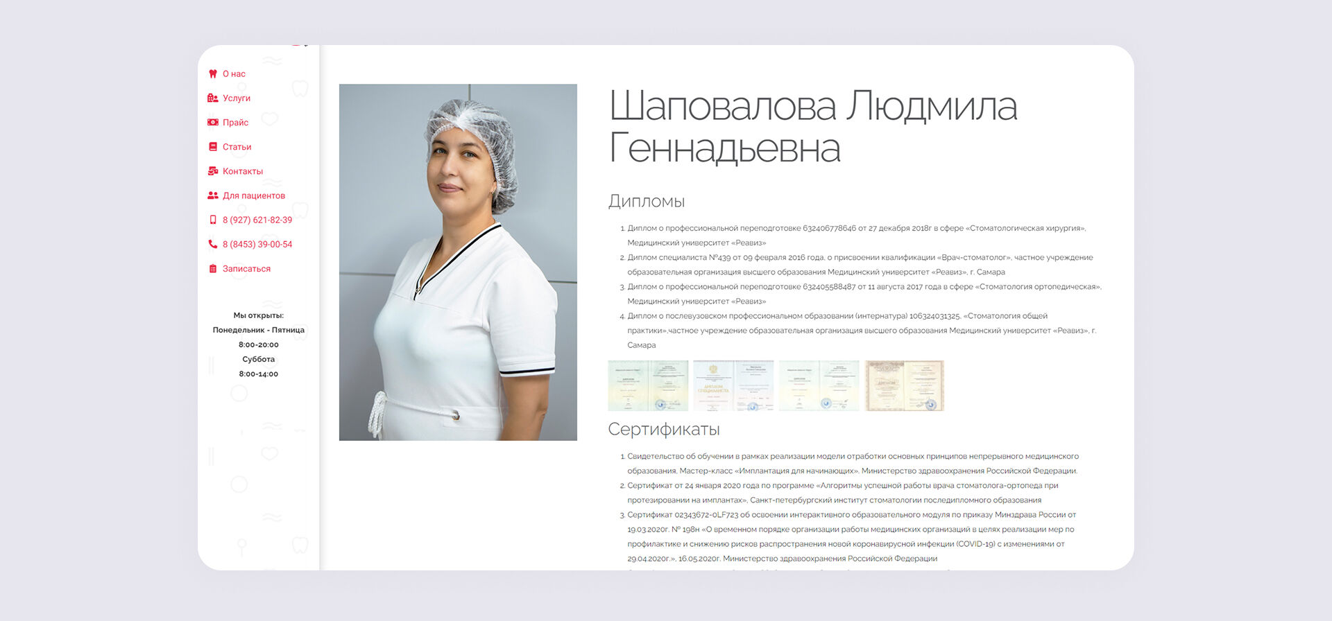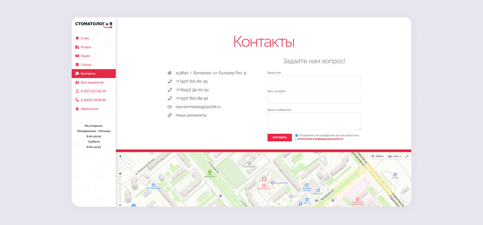 Так как сайт стоматологической клиники — то фон на сайте — стопудов белый. Иначе и быть не может, как и то, что номера телефонов на сайте должны быть кликабельны и предлагать устройству позвонить.