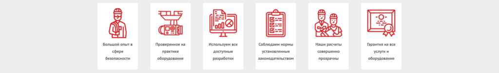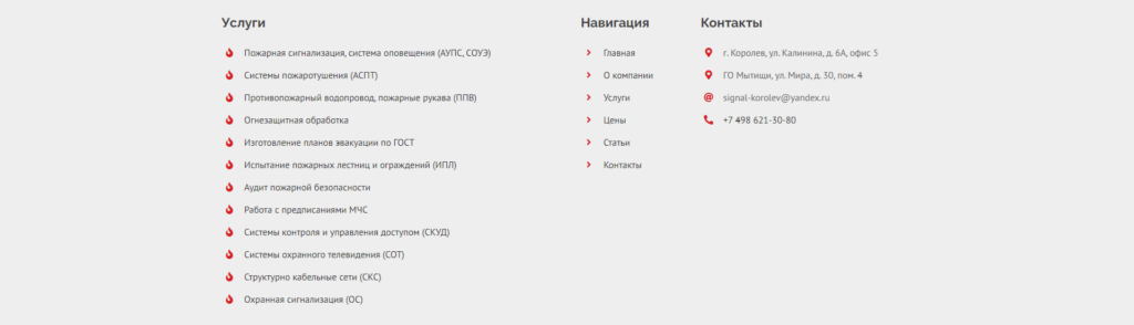 Лаконичные иконки, и классическое дублирование информации представленных на других страницах сайта.
