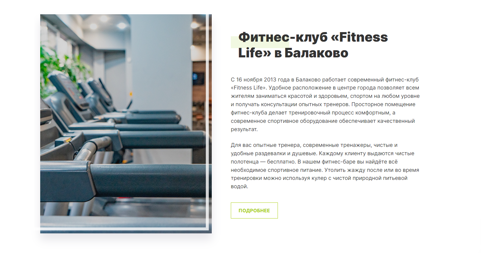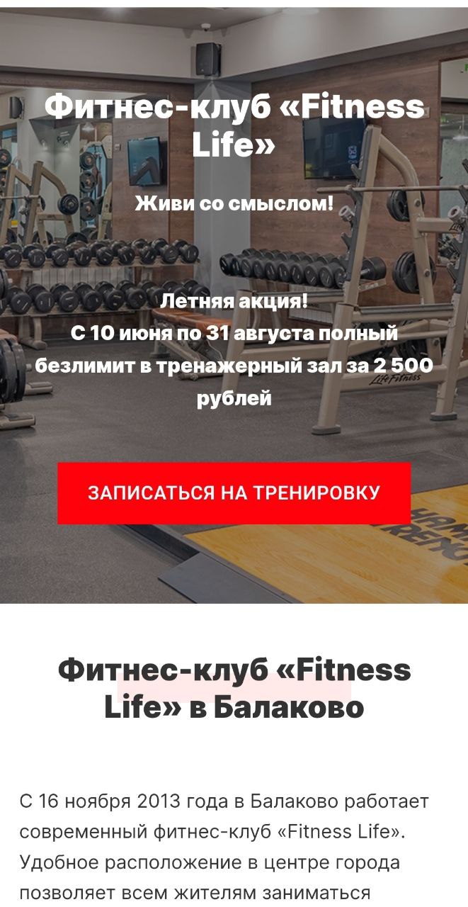 Создать сайт для фитнес клуба в городе Балаково «Fitness Life», который предоставляет информацию о услугах, персонале и преимуществах.