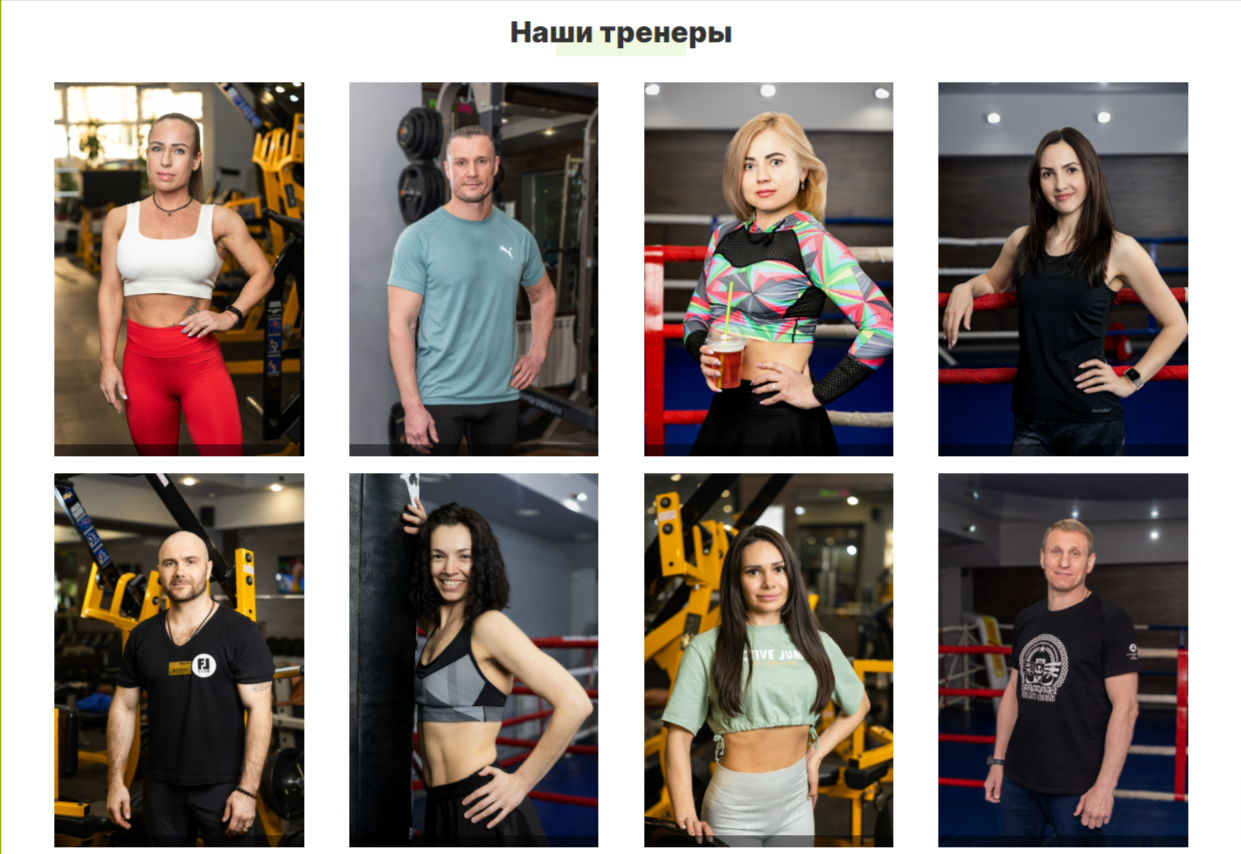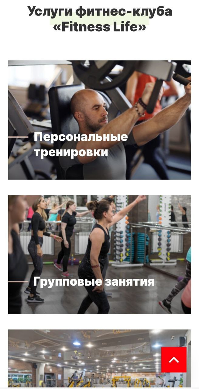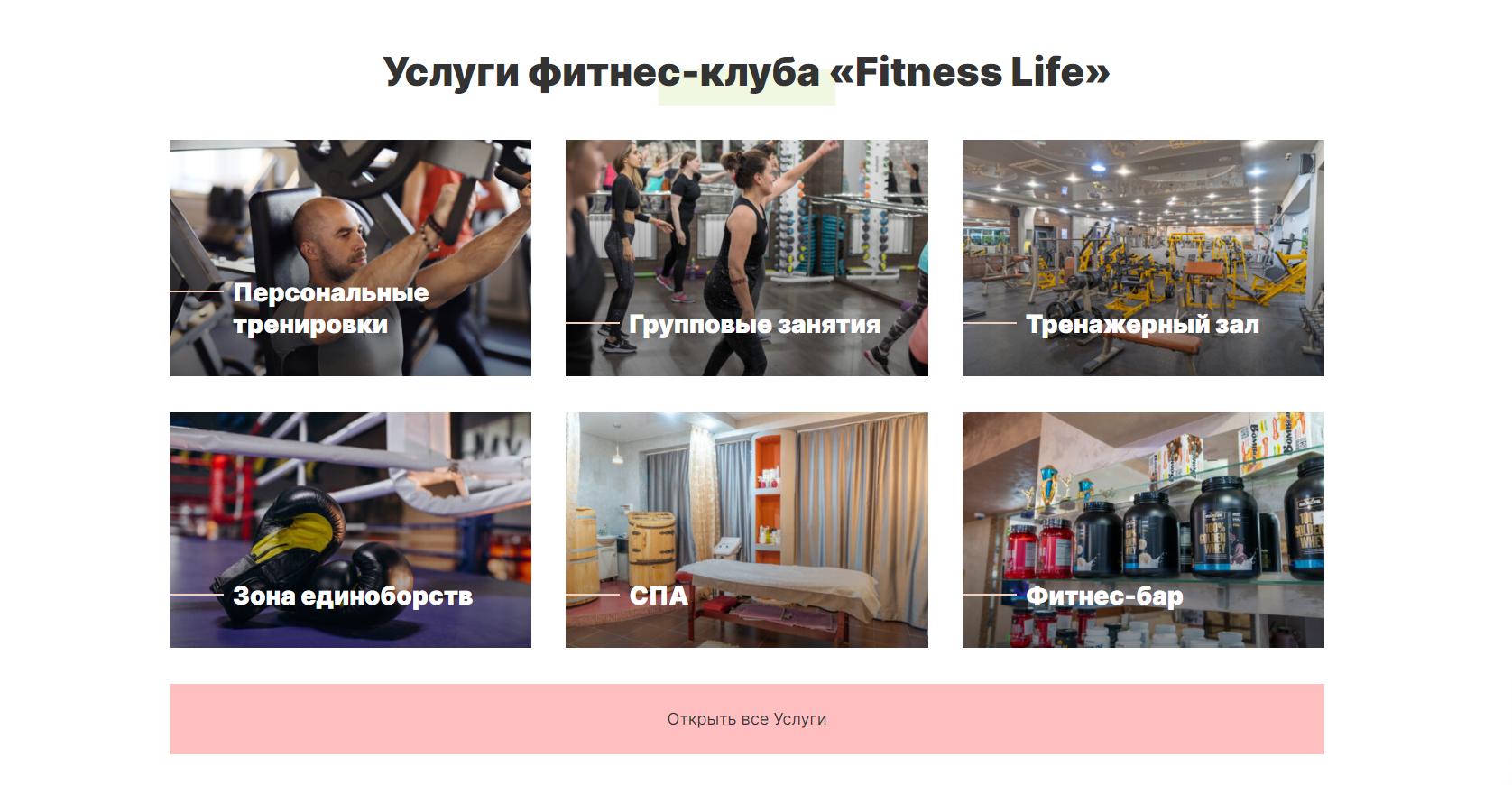 Ниже мы разместили услуги, которые предоставляет фитнес-клуб. Размещение услуг на главной странице позволяет клиентам быстро и удобно ознакомиться с имеющимися предложениями и выбрать подходящие программы тренировок.