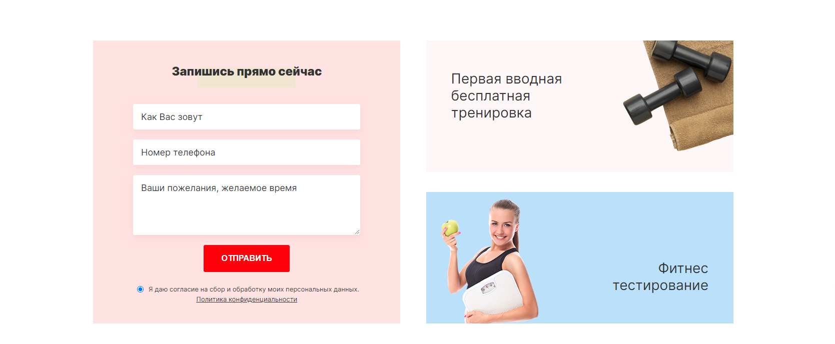 Дополнительно вывели контактную форму для записи на услуги, чтобы сделать процесс взаимодействия с потенциальными клиентами более удобным и быстрым, а также в дополнение разместили информацию о первой вводной тренировке.