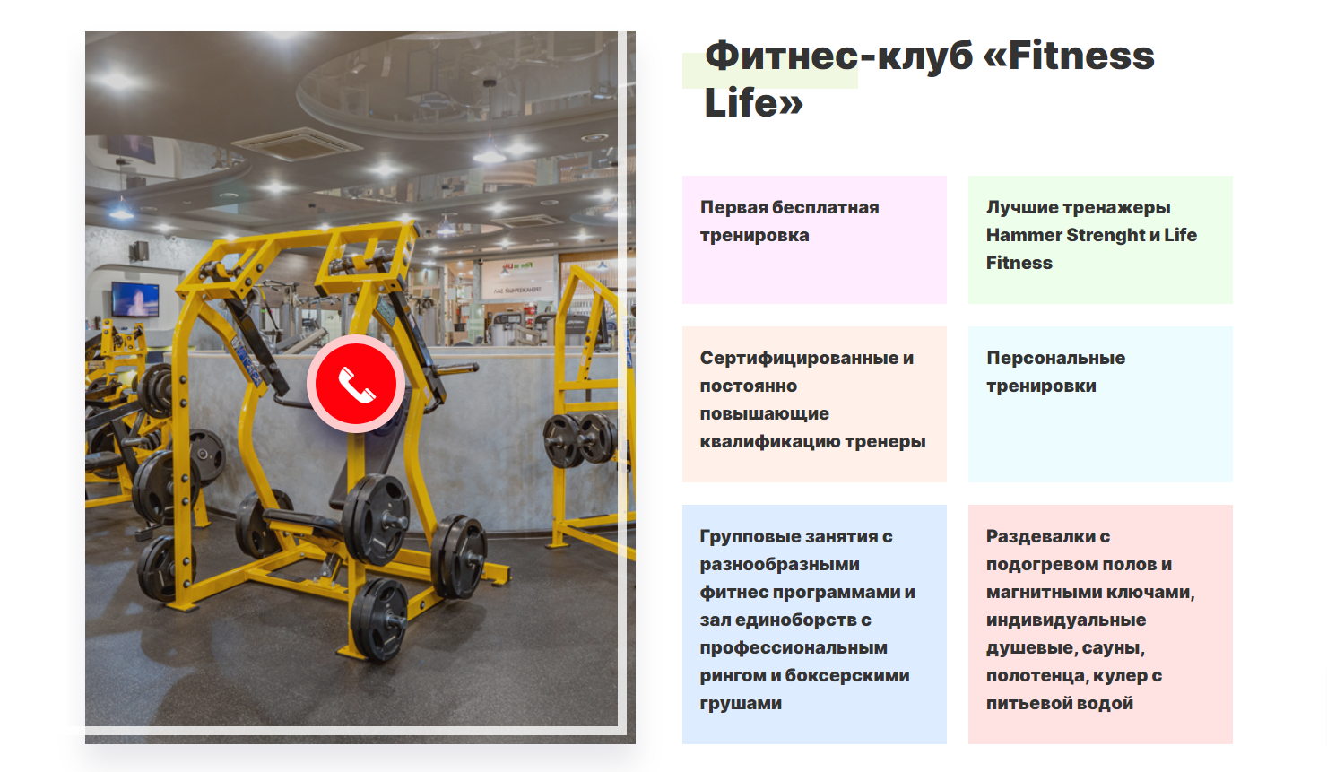 На странице мы разместили раздел с ключевой информацией, который подчеркивает основные преимущества посещения данного фитнес-клуба.