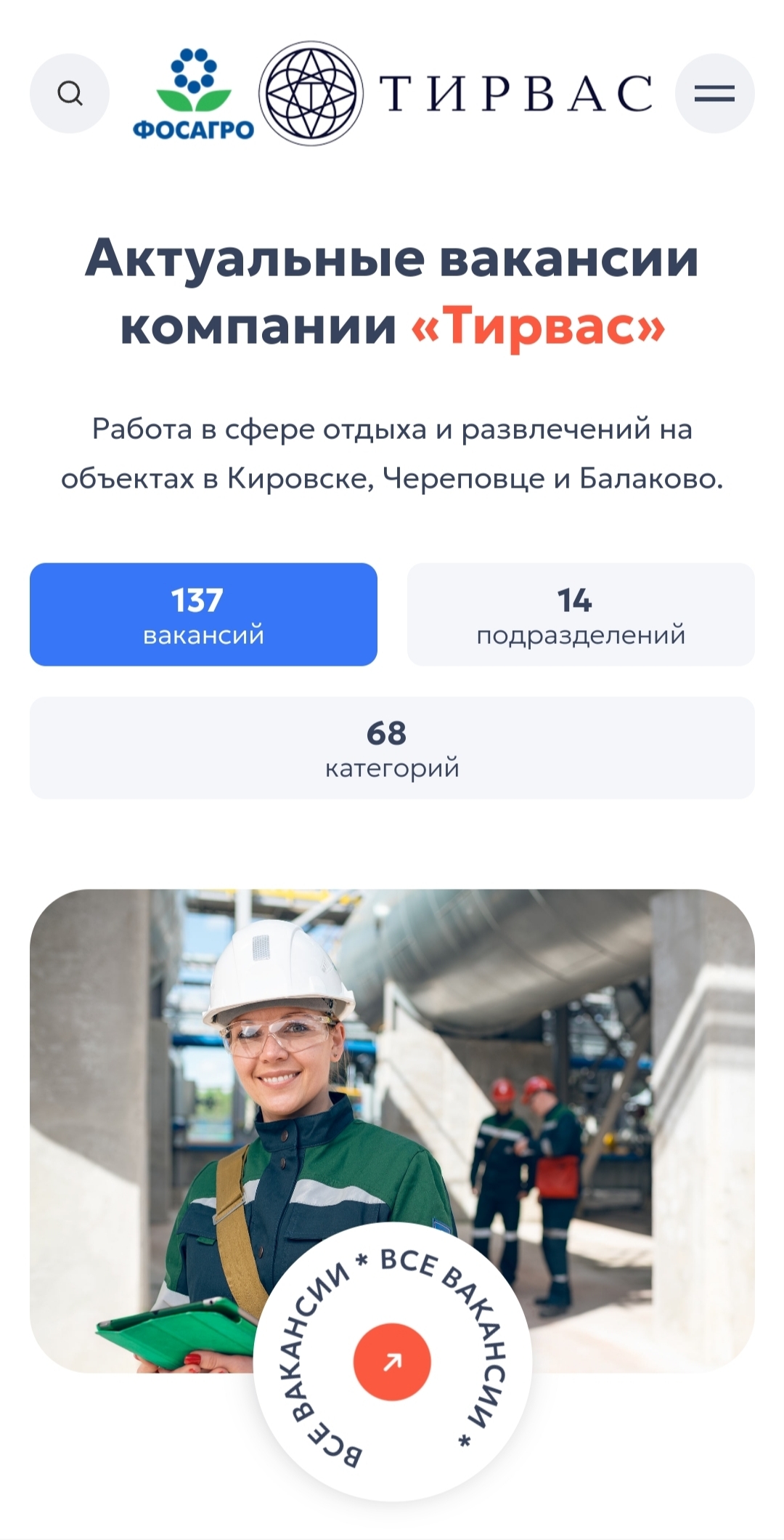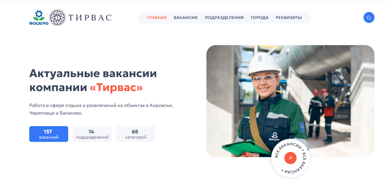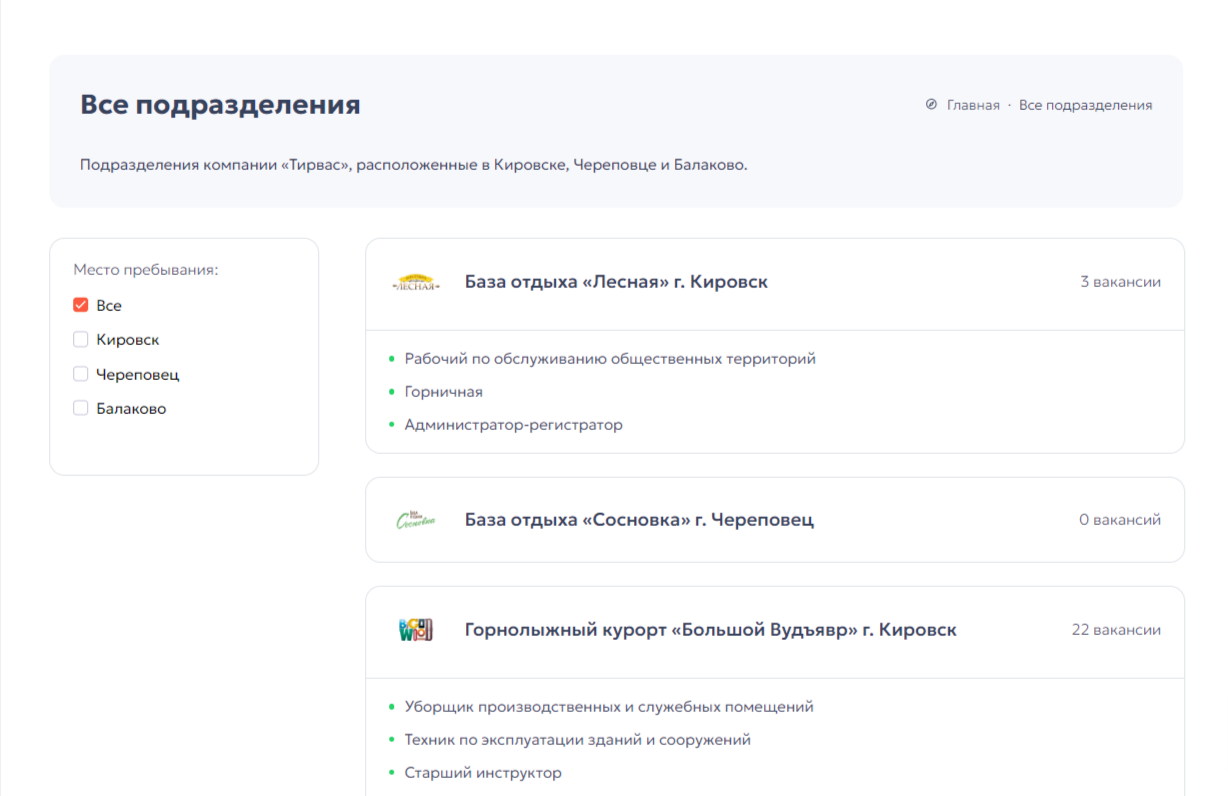 В данной вкладке представлены все подразделения компании, а также предусмотрена фильтрация по городам. Всё это позволяет легко и быстро находить актуальные вакансии в интересующем регионе.
