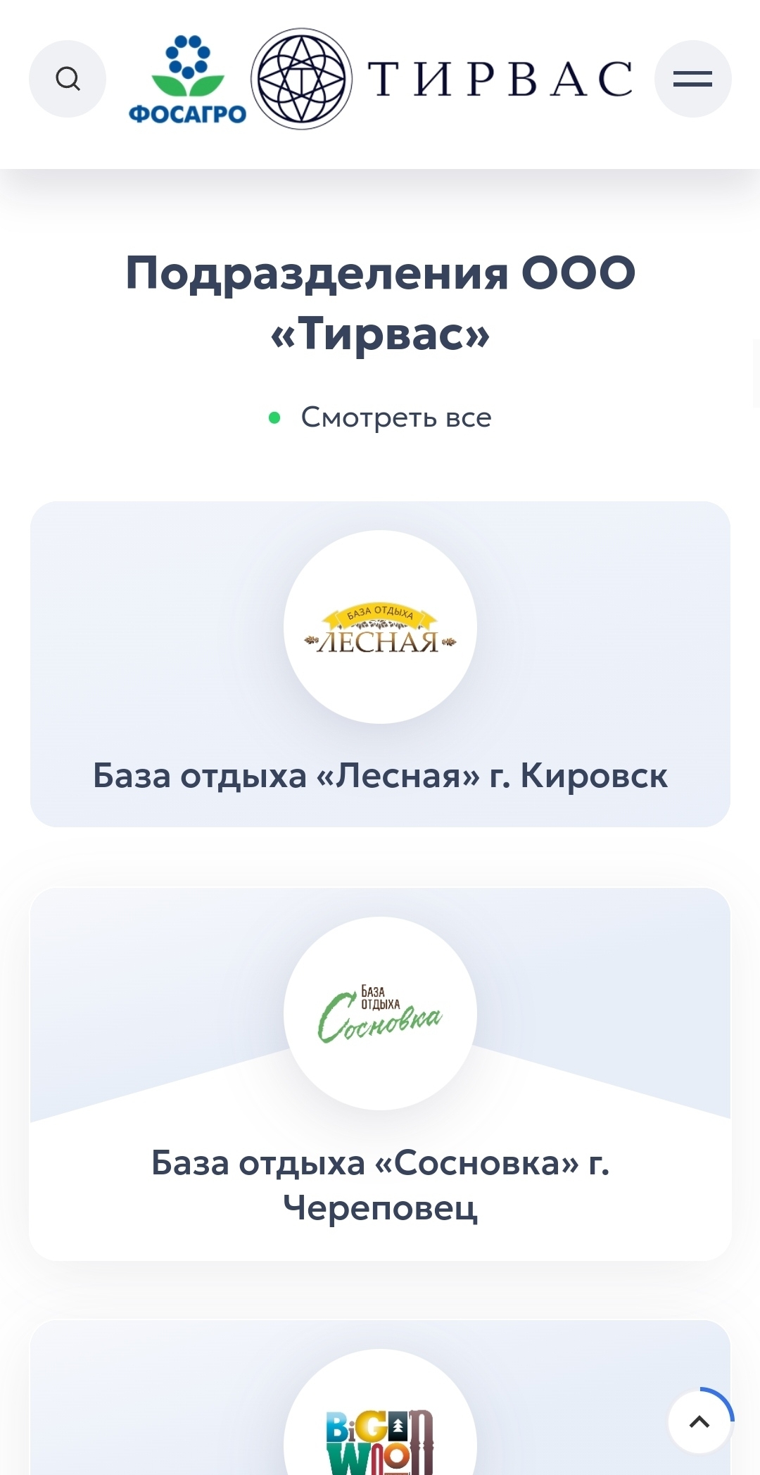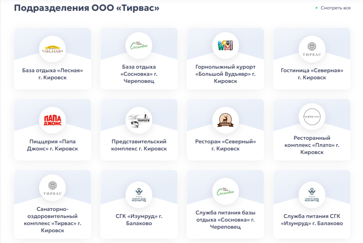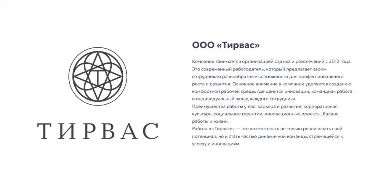 В завершении главной страницы разместили информацию о компании «Тирвас». Блок знакомит пользователя с историей, миссией и ценностями компании. Данная информация формирует и дополняет представление о ней.