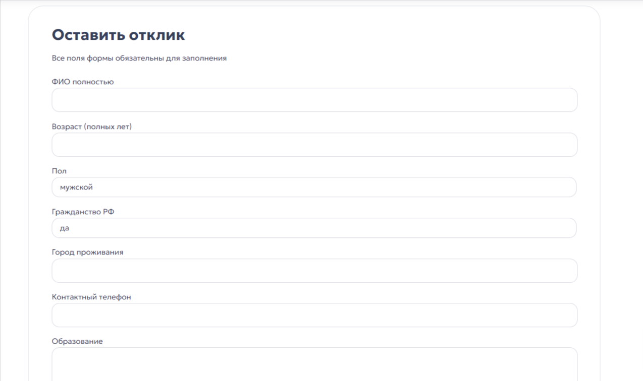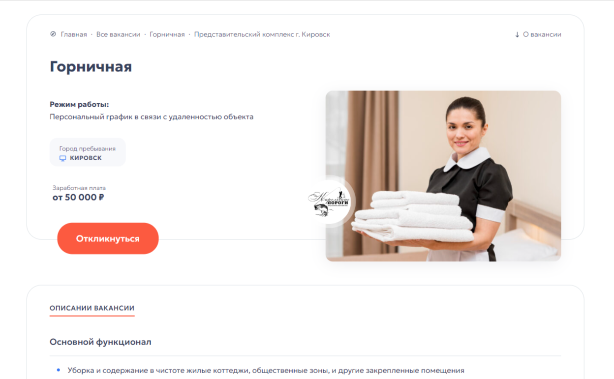 При клике на ту или иную вакансию пользователя встречает подробная информация о ней, включая описание должностных обязанностей, требования к кандидатам и условия работы. Также предусмотрена возможность откликнуться на вакансию через заполнение удобной контактной формы.
