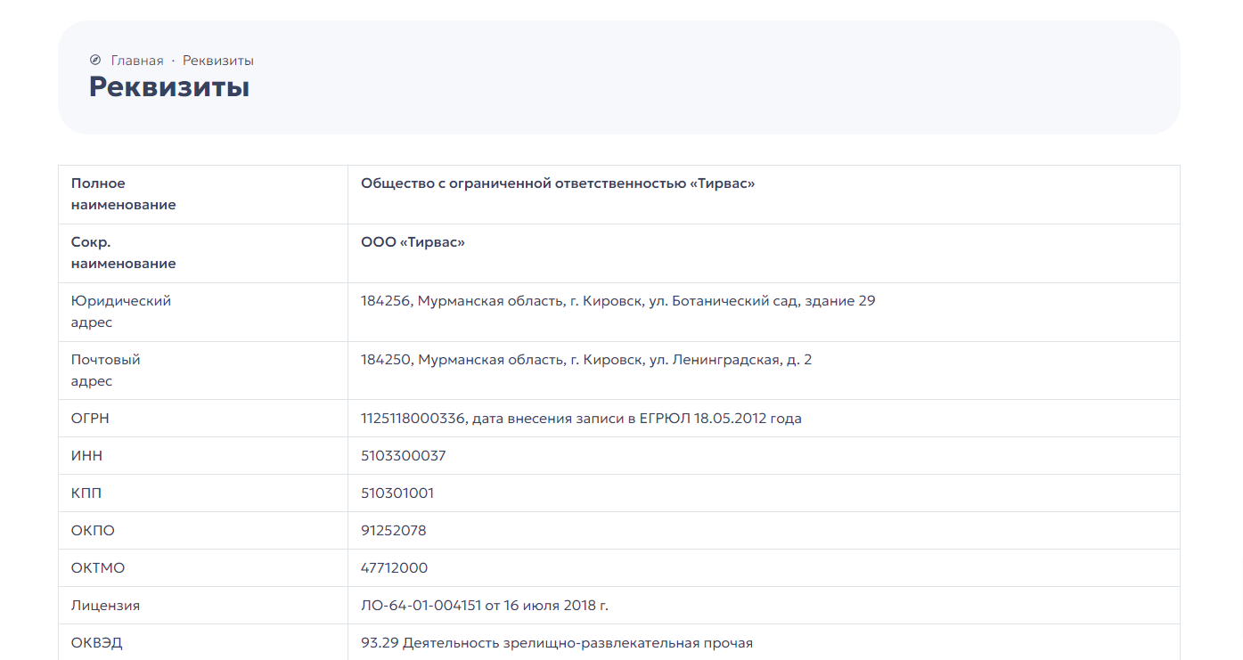 Последняя вкладка «Реквизиты» содержит важную информацию, необходимую для успешного взаимодействия с компанией. Здесь пользователь найдет её юридический адрес, банковские реквизиты, контактные телефоны и электронную почту.