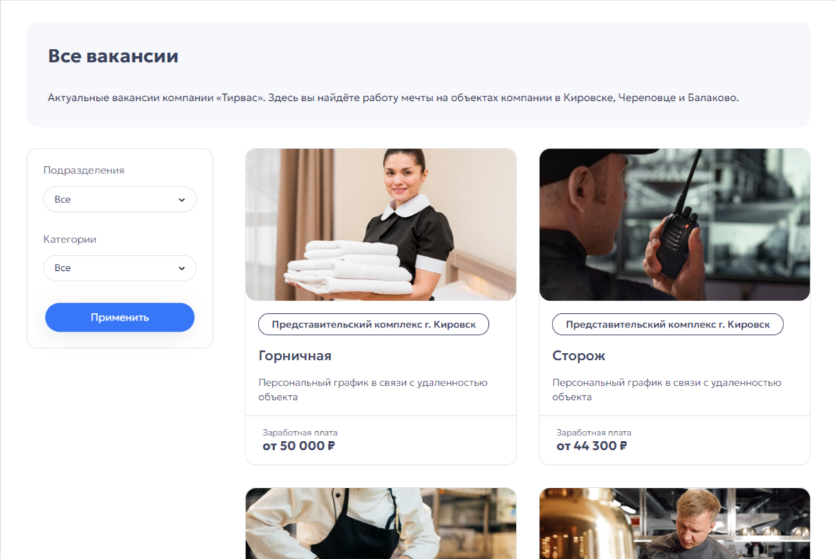 На данной странице представлен полный перечень вакансий. Кроме того, предусмотрена удобная система фильтрации по таким параметрам, как подразделение и категории, чтобы помочь пользователю сузить поиск и найти именно ту позицию, которая соответствует его интересам и квалификации.