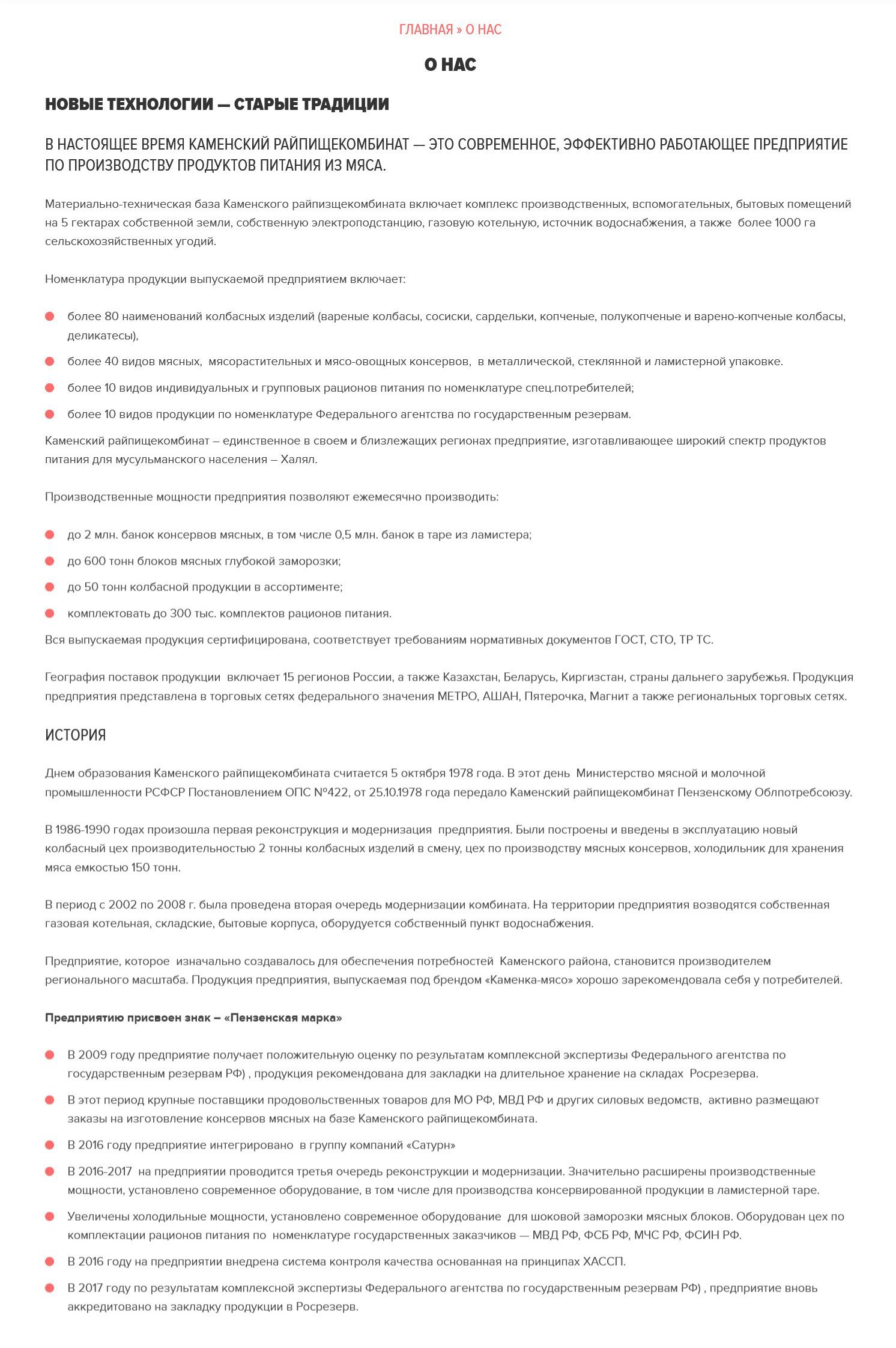 К нам обратился комбинат — производитель готовой еды, колбас, консервов и сухого пайка в Пензенской области и Поволжье — «Каменский райпищекомбинат». Задача, сделать сайт с актуальным каталогом продукции.