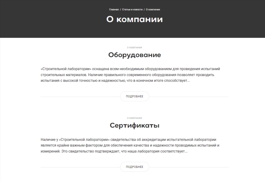 Для тех, кто желает узнать подробнее о компании была создана страница «О компании». Также в этом разделе можно найти такие вкладки, как «Оборудование» и «Сертификаты».