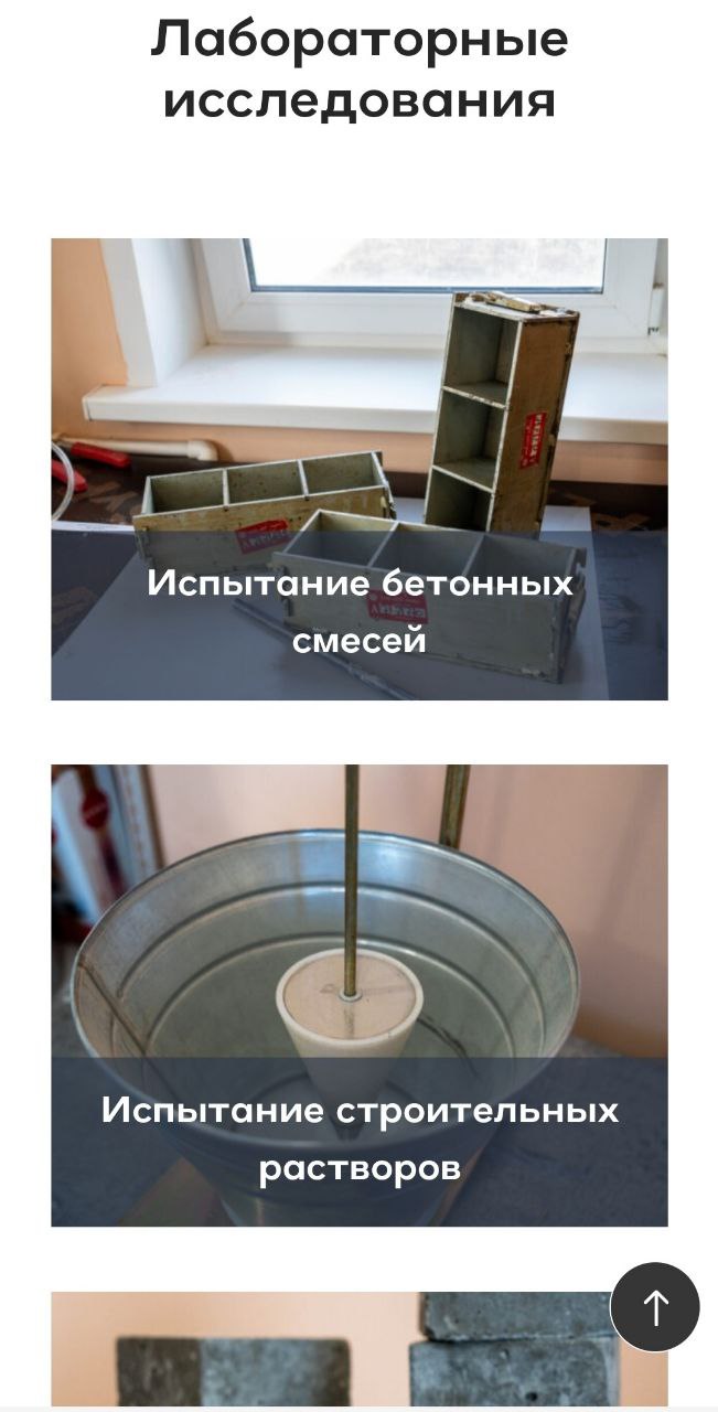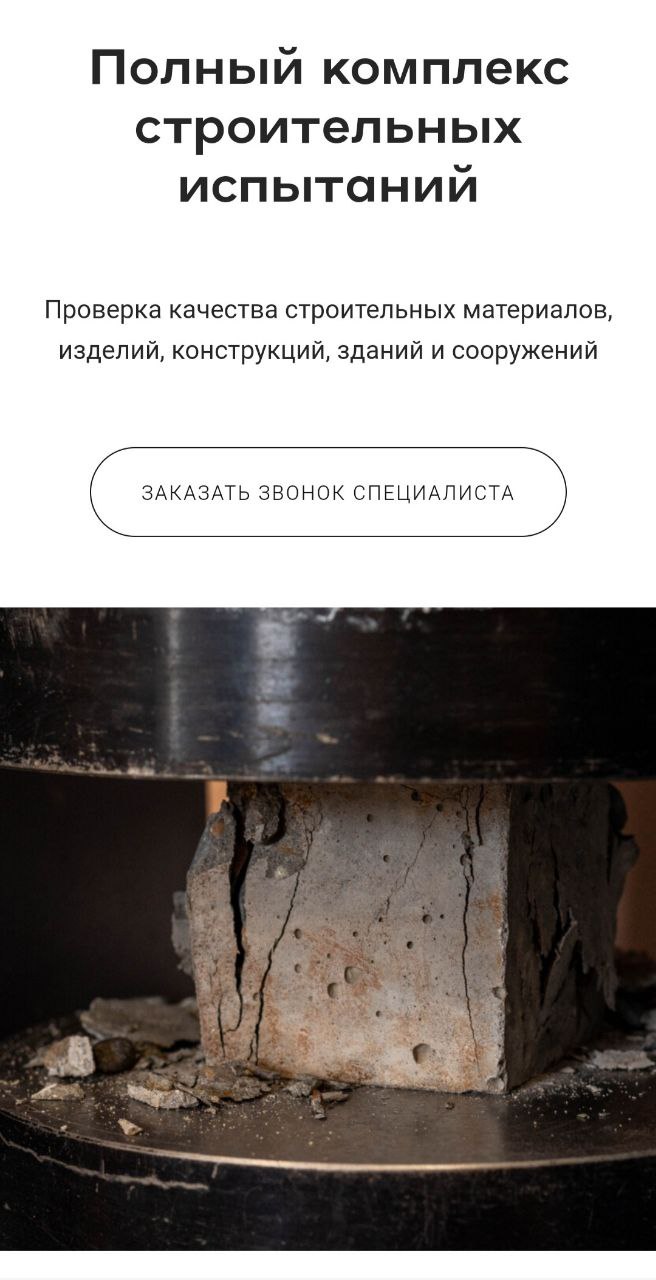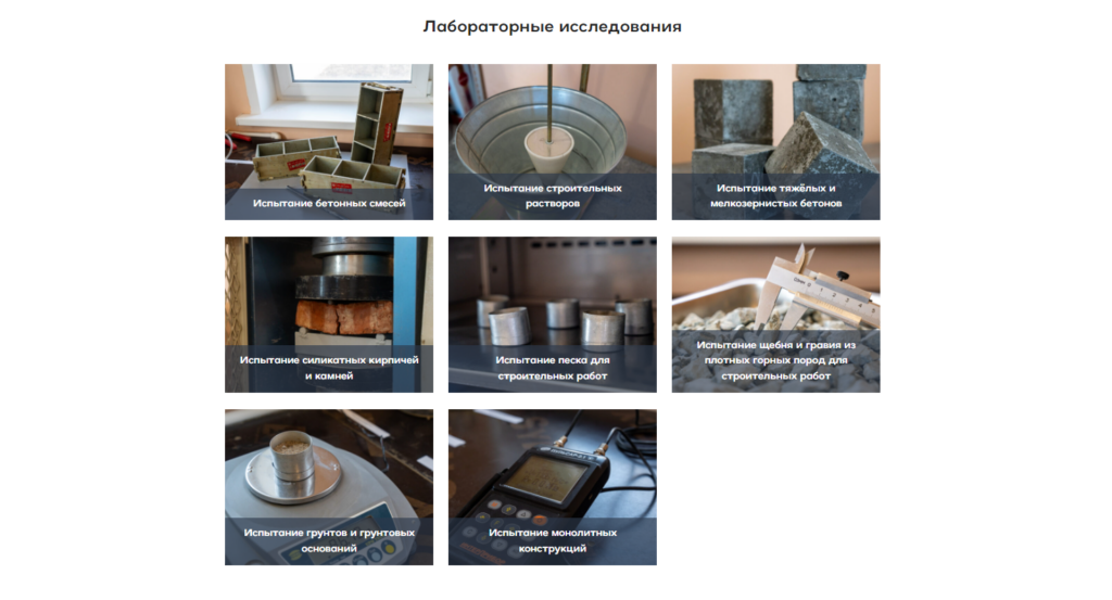 Во время подготовки к сбору контента и выбору макета мы провели детальный анализ услуг, предлагаемых компанией, а также выявили ключевые преимущества и сильные стороны. Собрали информацию о производствах, которые доверяют компании и активно пользуются услугами «Строительной лаборатории».