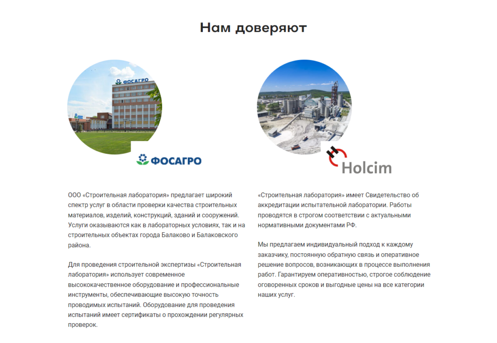 После каталога представлен раздел «Нам доверяют», в котором показаны ключевые клиенты «Строительной лаборатории». Здесь же отражены качества и преимущества, демонстрирующие надежность и профессионализм компании. «