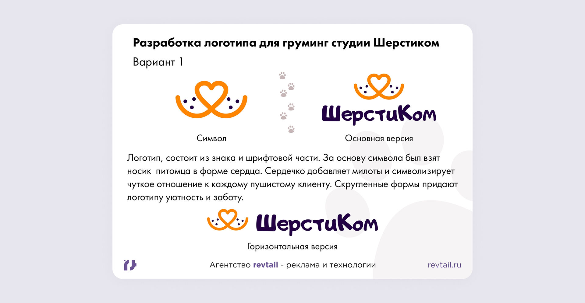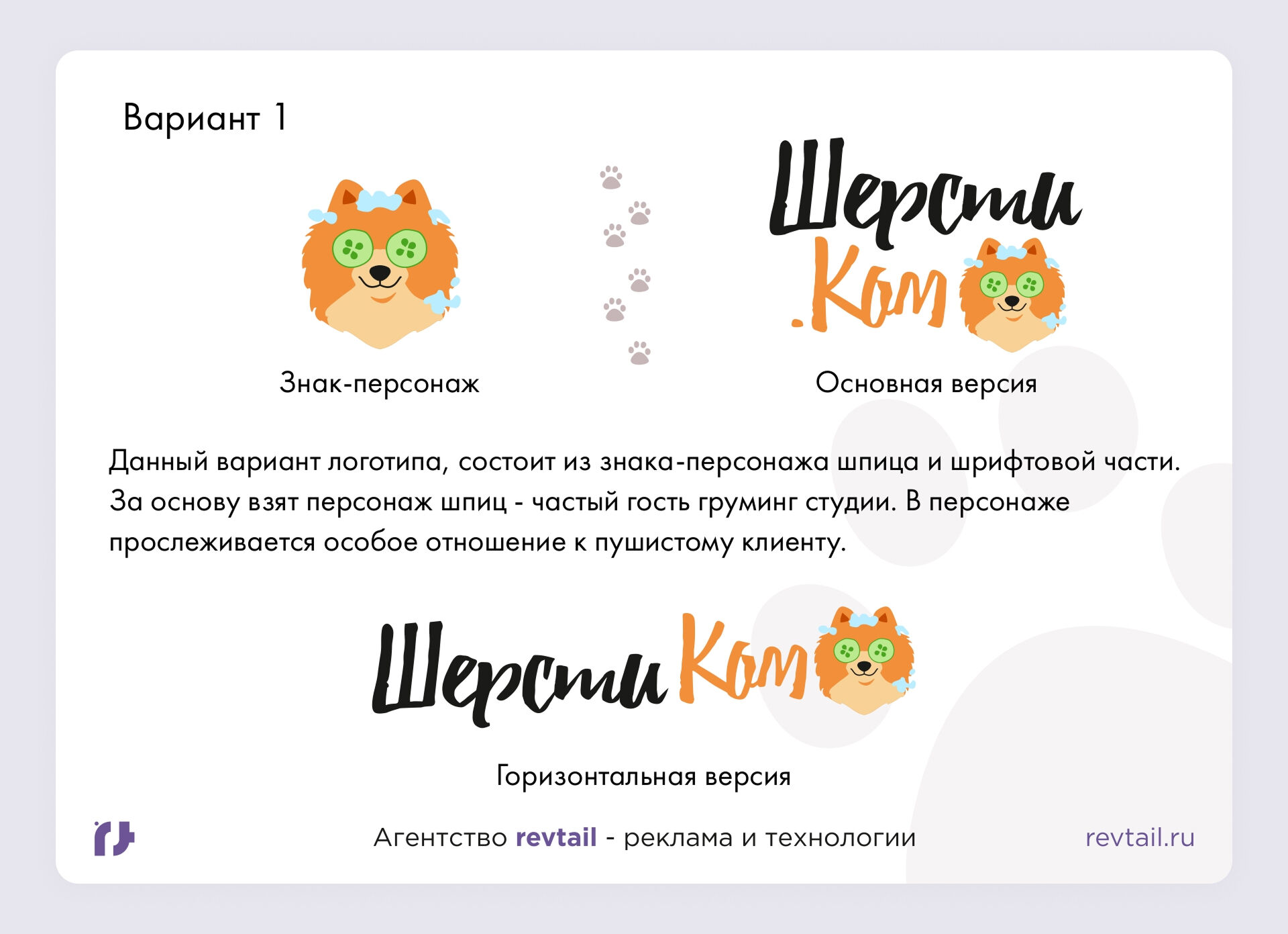 Нами были разработаны и предложены различные варианты логотипа, каждый из которых отражает уникальность груминг-студии. Эти варианты учитывают различные стилистические предпочтения и целевые группы.