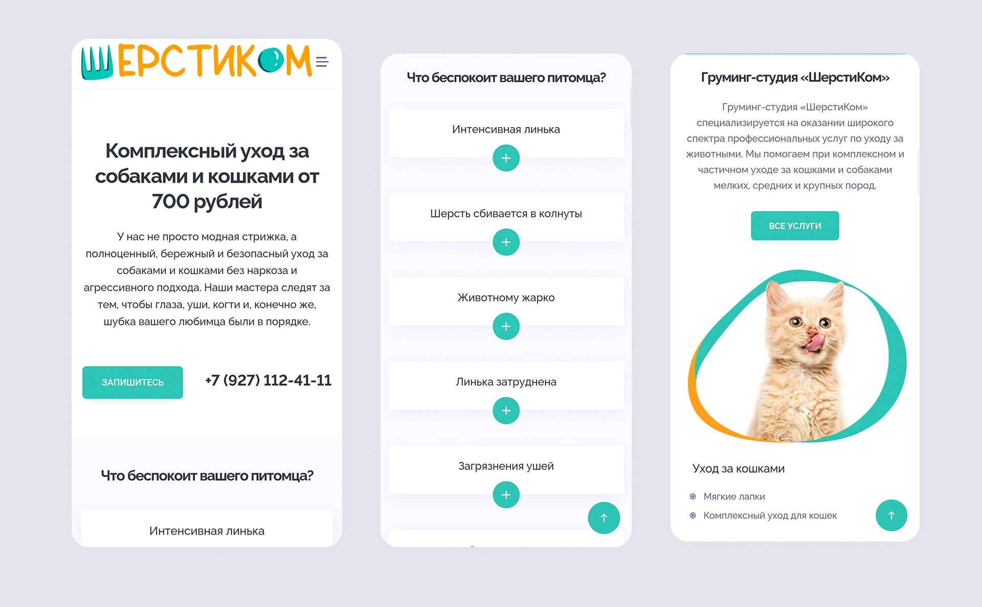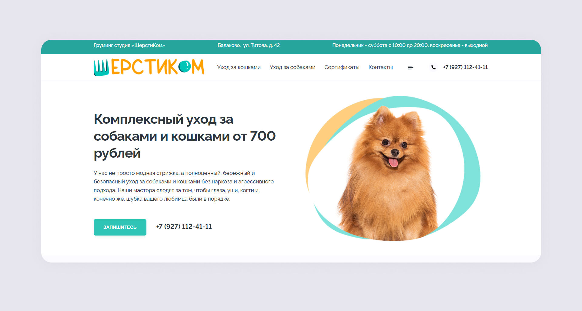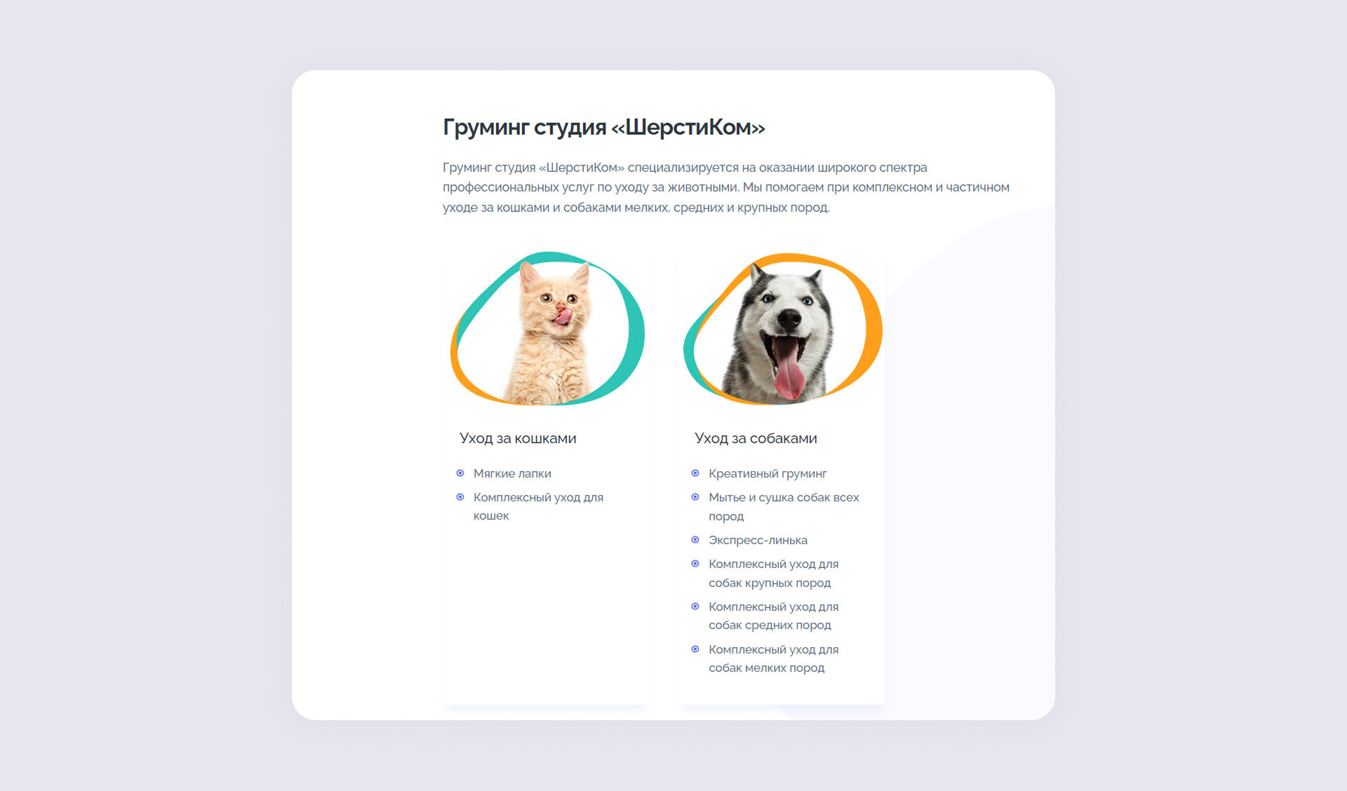 Во время подготовки к сбору контента и выбору макета будущего сайта проанализировали услуги груминг-студии «ШерстиКом». В ходе этого исследования удалось выявить ключевые преимущества и сильные стороны студии: использование современных технологий и качественных материалов, а также способствующая комфортному пребыванию животных атмосфера. Эти моменты легли в основу формирования контента.