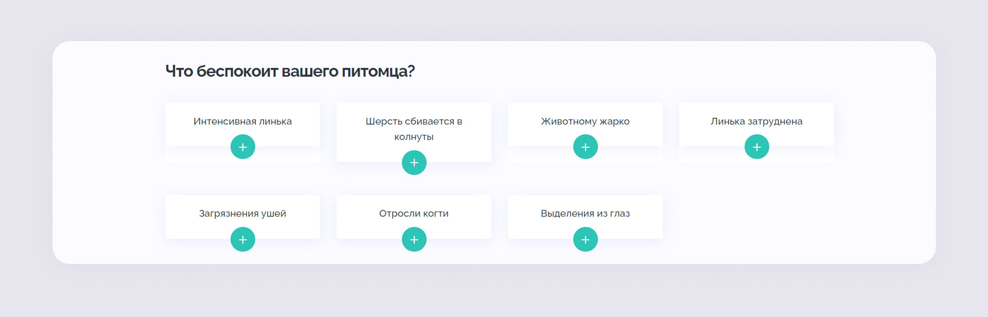 Следующим блоком мы добавили каталог, разделённый на две основные категории с профессиональными услугами по уходу за кошками и собаками. Это также облегчает поиск нужной информации пользователем.