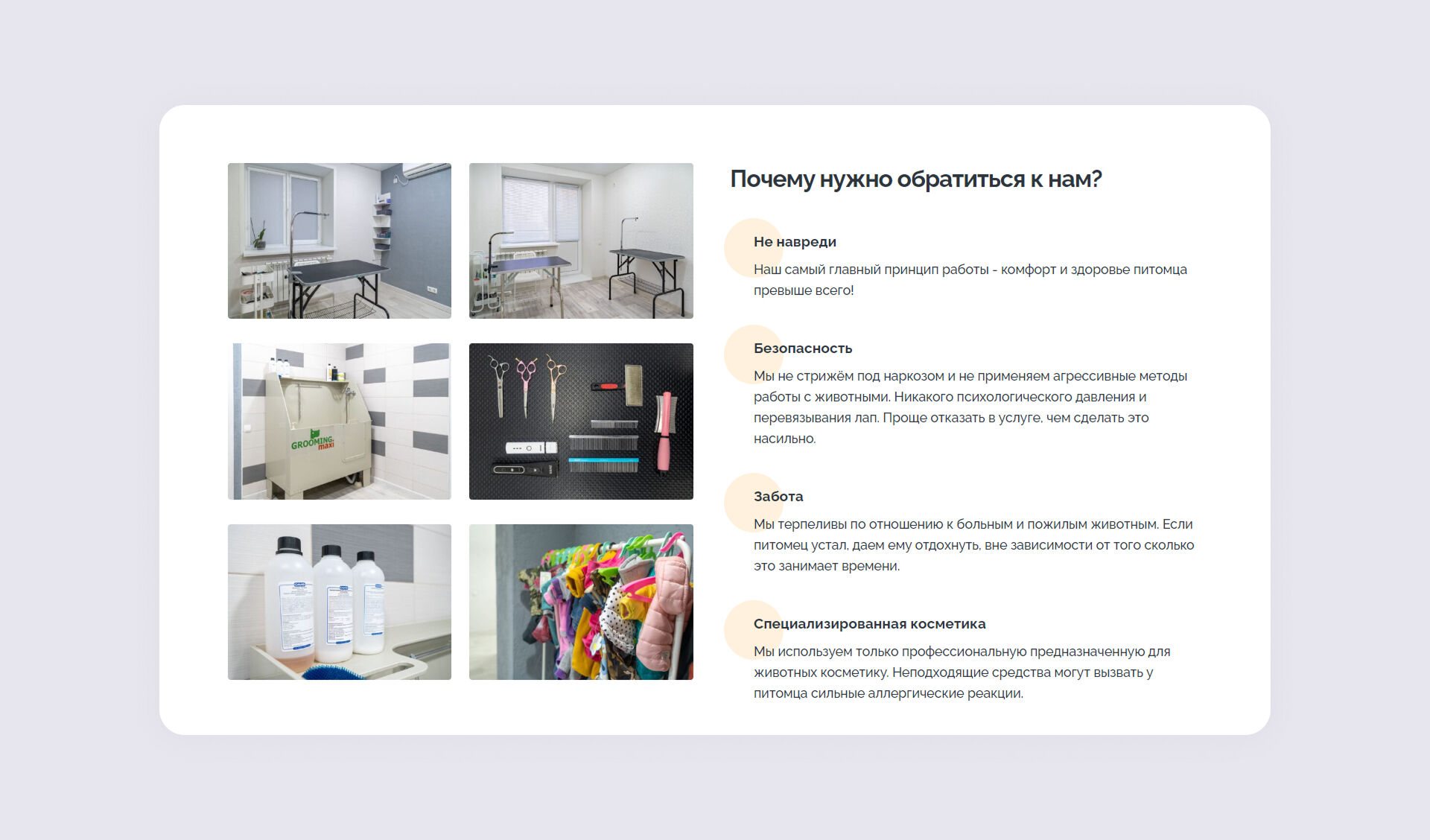 Не обошлось без блока с преимуществами. В этом разделе мы подробно рассказали о том, почему стоит выбрать данную груминг-студию. Выделили комфорт, заботу о каждом пациенте, безопасность и специализированную косметику. Блок сильных сторон помогает потенциальным клиентам понять, что выбор «ШерстиКом» — это не только забота о внешнем виде питомца, но и, что немаловажно, о его здоровье и благополучии.