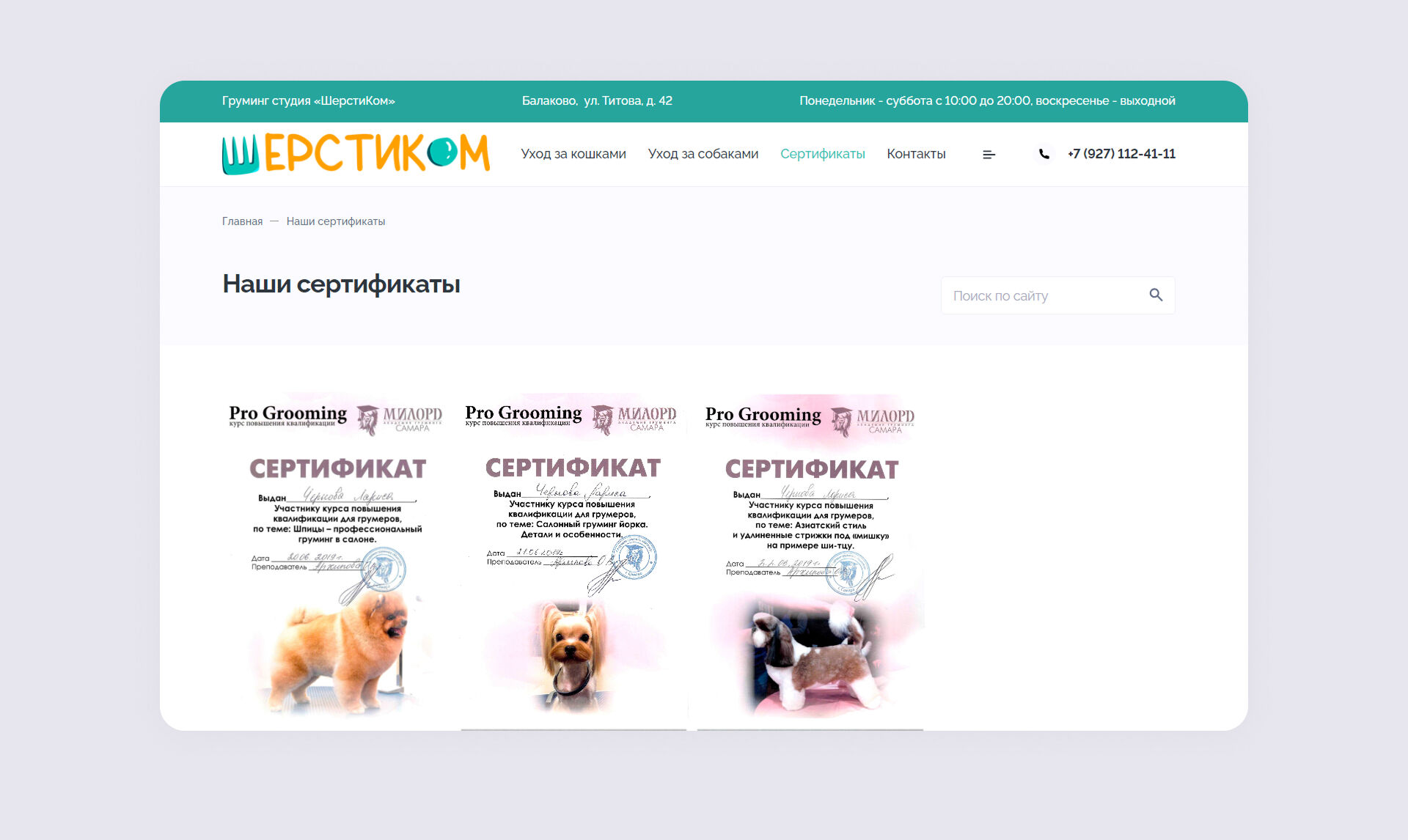 Груминг-студия «ШерстиКом» зарекомендовала себя, как компания с профессиональным подходом и высоким качеством услуг. Стремясь предоставить клиентам полную информацию об опыте и квалификации сотрудников, мы сделали отдельную вкладку с подтверждающими это сертификатам. Это также помогает клиентам чувствовать себя более уверенно при выборе студии для ухода за своими любимцами.