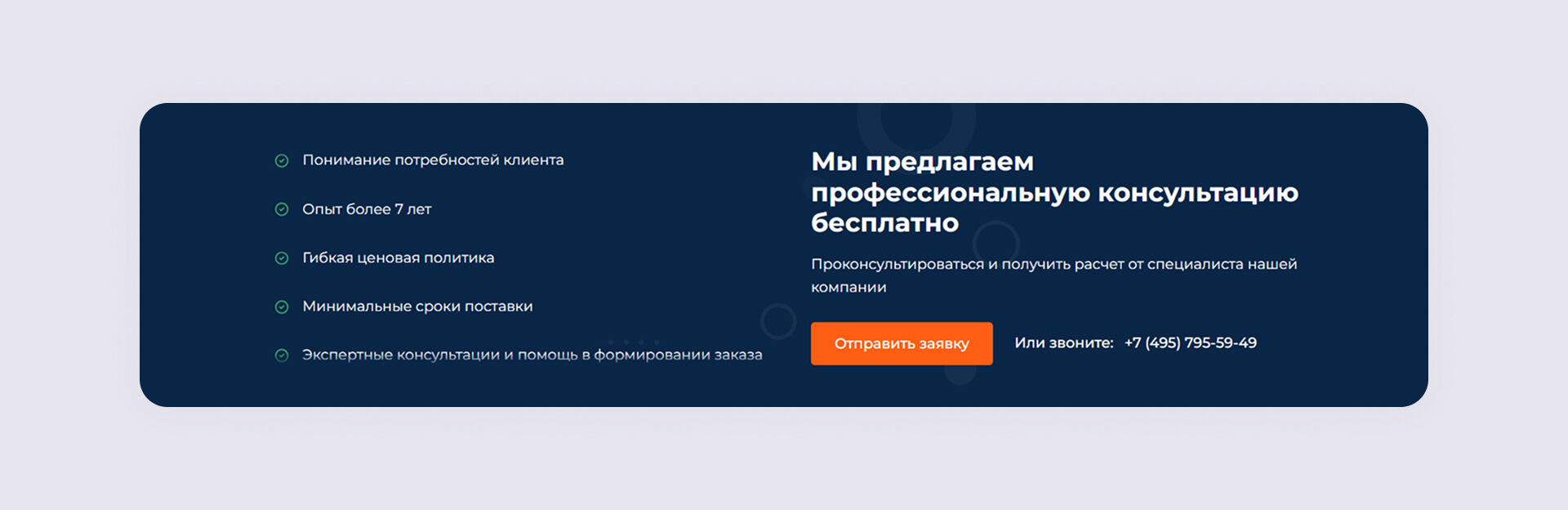 На Главной странице сайта информационные блоки гармонично чередуются с формами Призыва к действию. Это гарантирует легкий доступ к контактной информации и делает процесс связи более удобным, оставаясь всегда на виду.
